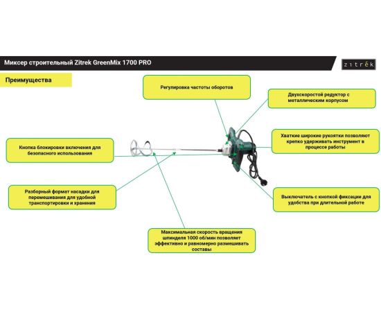 Миксер строительный Zitrek GreenMix 1700 PRO предназначен для перемешивания красок, клеев, герметиков, лаков, штукатурки, строительных растворов и смесей.