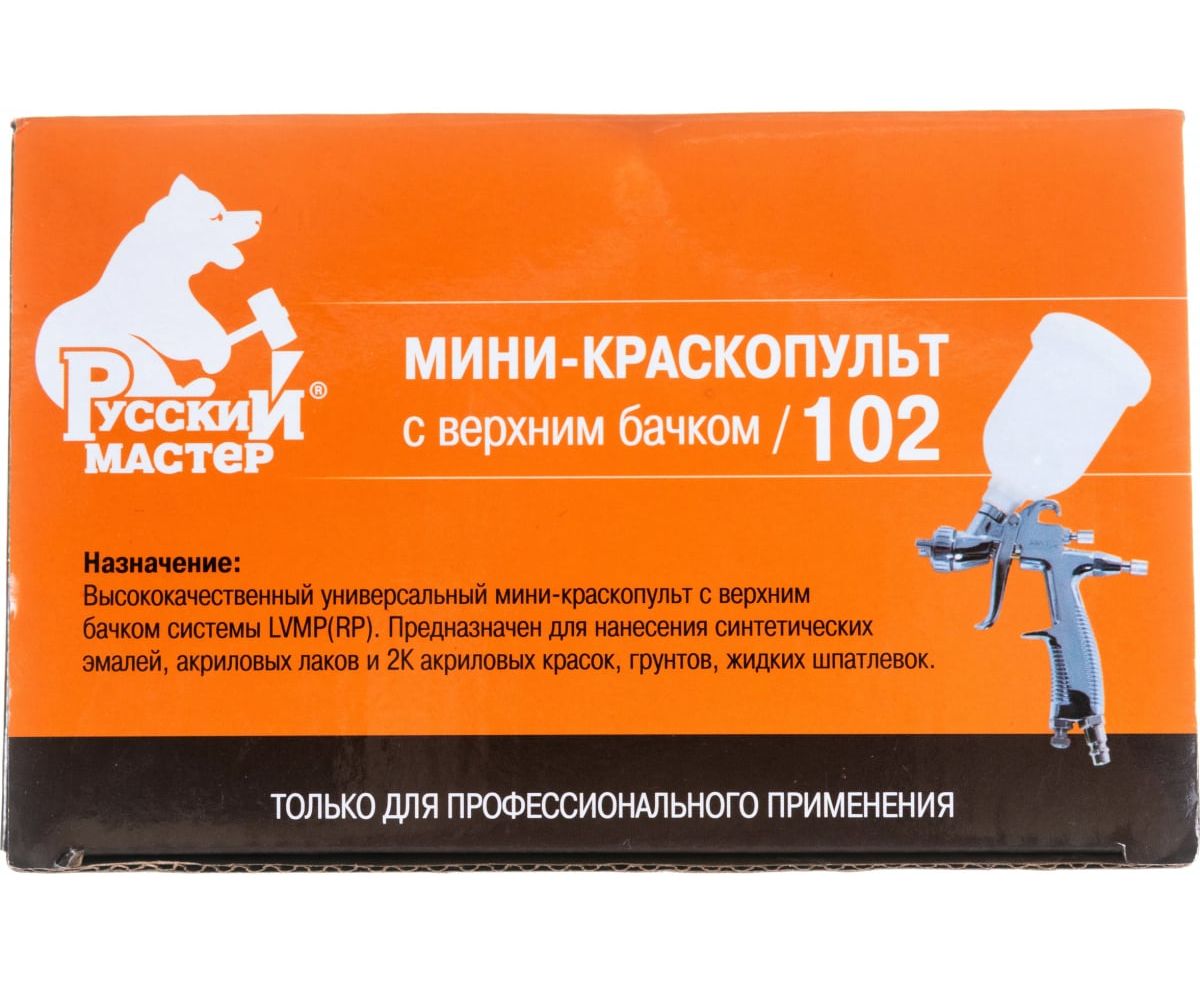 Мини-краскопульт Русский Мастер 102 дюза 1.0 РМ-14986 применяется для нанесения синтетических эмалей, акриловых лаков и 2К акриловых красок, грунтов, жидких шпатлевок. Благодаря системе LVMP отличается низким потреблением сжатого воздуха.
