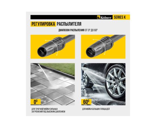 Регулировка распылителя: Изменяет форму струи от мощной до веерной с углом до 60°, обеспечивая гибкость в очистке.