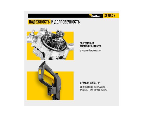 - Система AUTO STOP: Автоматическая остановка мотора при отпускании спускового крючка экономит воду и продлевает срок службы насоса