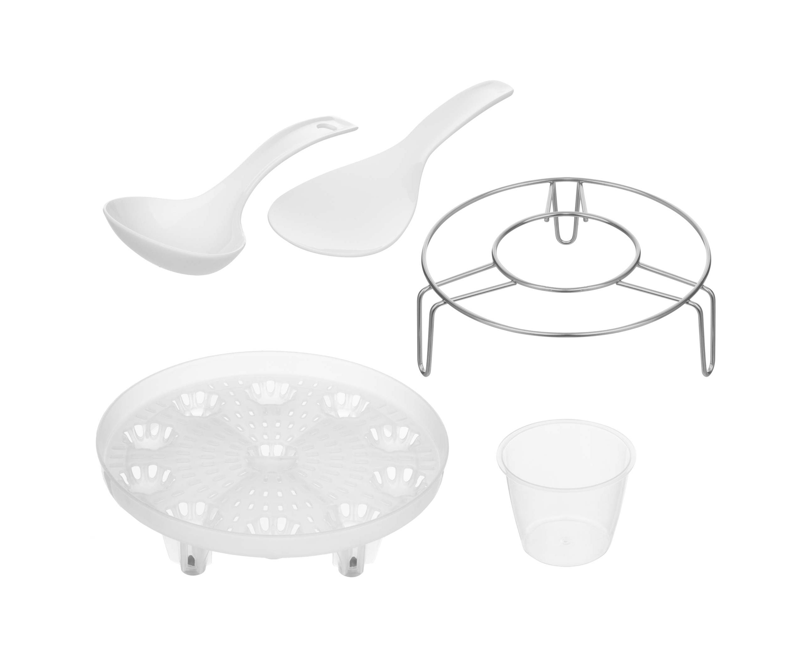 Комплектация: Скороварка с емкостью объемом 5,5 л, совочек для риса, ложка для риса, мерная емкость, металлический треножник, сетка для приготовления на пару