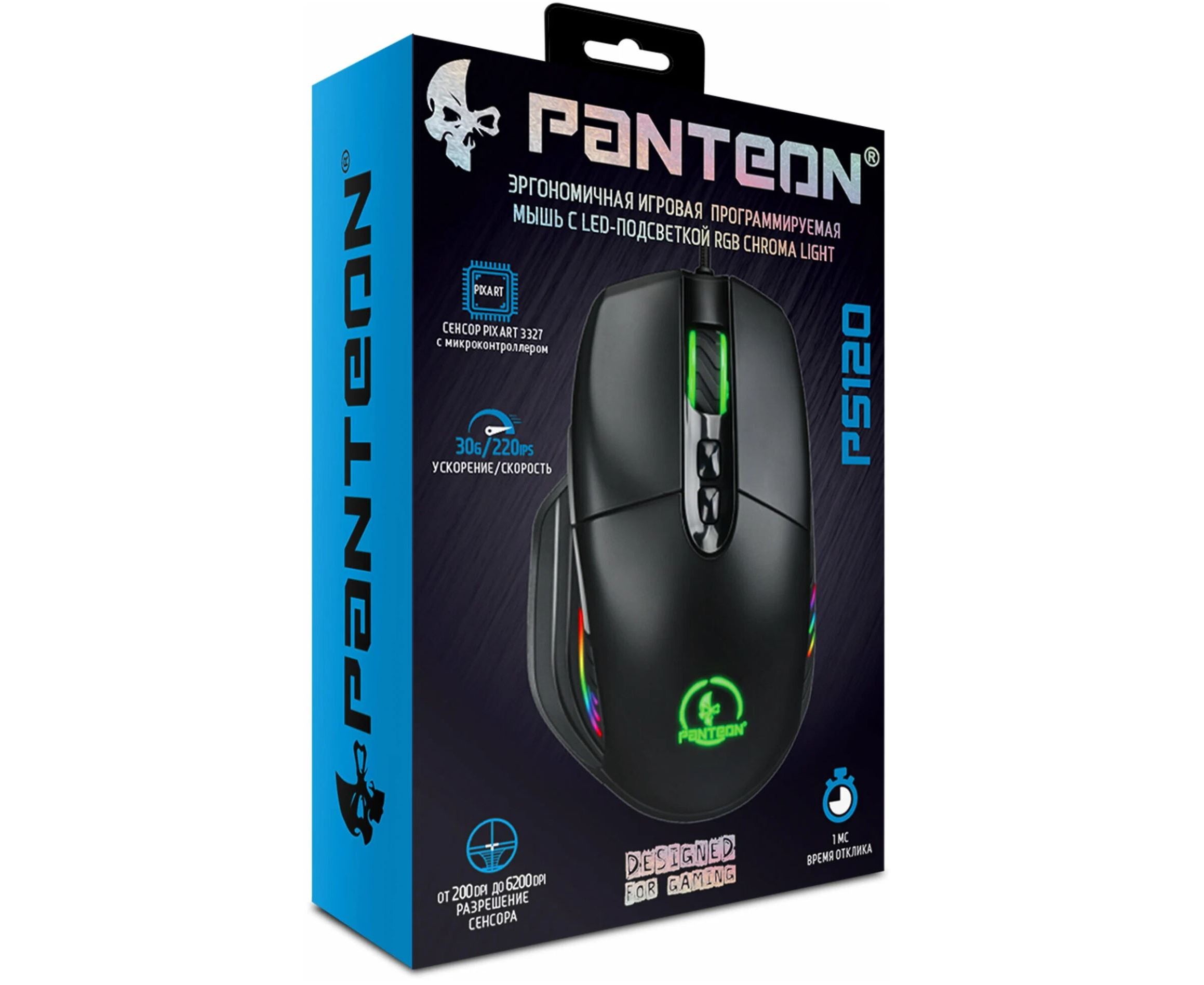 Игровая программируемая мышь с LED-подсветкой RGB Chroma Light PANTEON PS120 черная Pixart 3327 с микроконтроллером, 220 IPS/30 G, 200-6400/12400 DPI