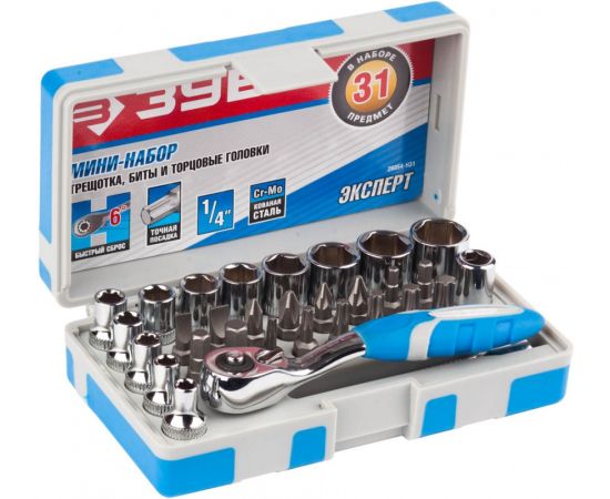 Описание: Биты из хромомолибденовой стали. Торцовые головки из высококачественной инструментальной стали. Трещотка оснащена реверсивным храповым механизмом, направление вращения меняется одной рукой. Специальная закалка по особой технологии Шариковый быстросъемный держатель.