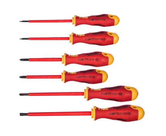 Набор диэлектрических отверток состоит из 4 шлицевых и 2 крестовых отверток.