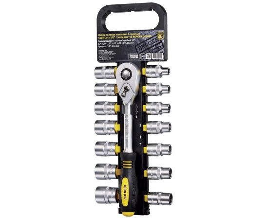 Набор головок торцевых BERGER BG2035 6-гранных SuperLock 1/2" (8-22мм) с трещоткой 1/2" 15 предметов