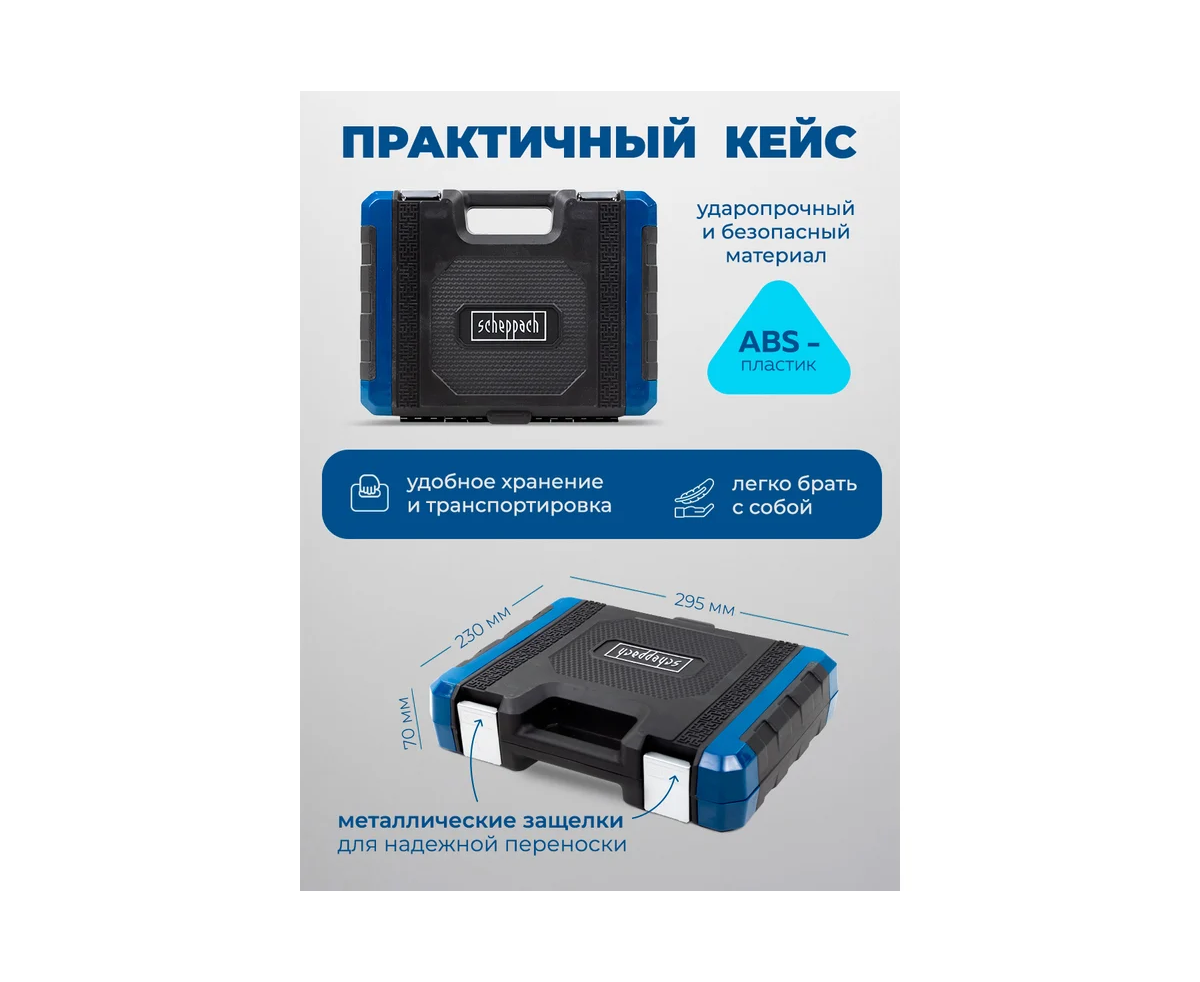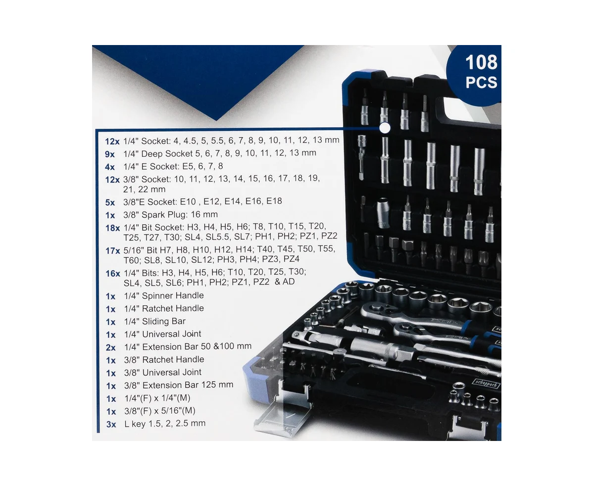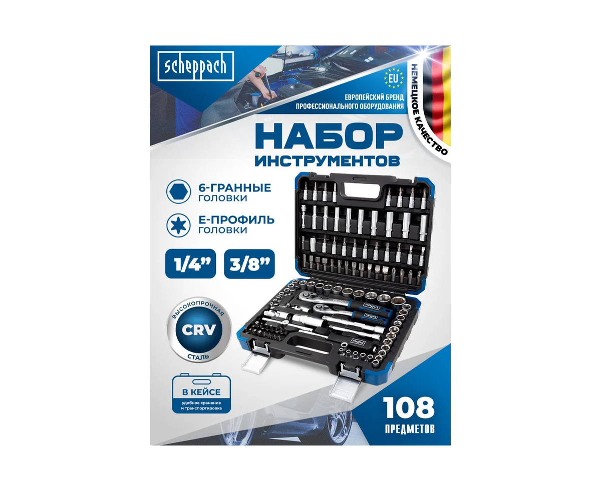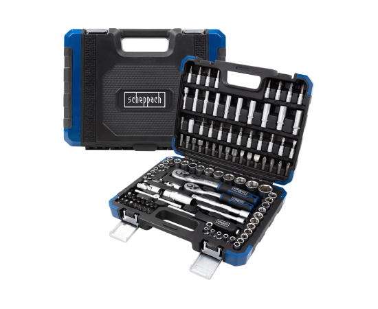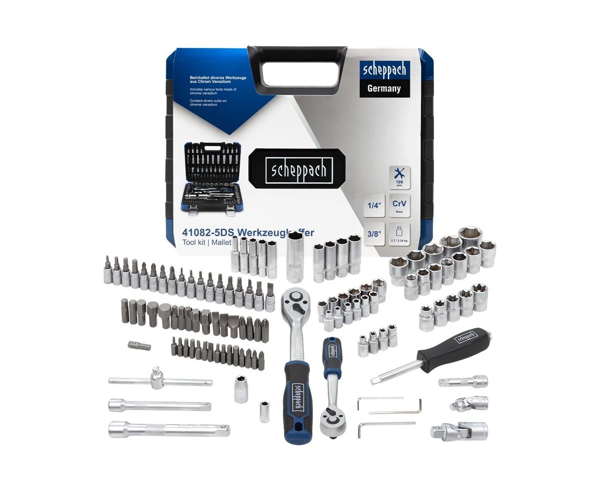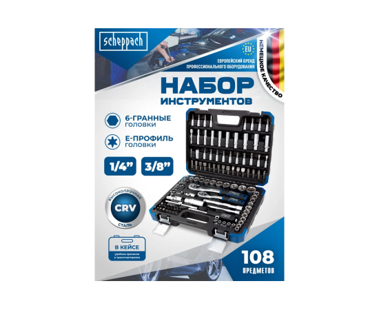 Набор инструментов состоящий из 108 предметов 1/4" и 3/8" от немецкого бренда Scheppach. Данный набор — это оптимальное решение для выполнения слесарных, монтажных и ремонтных работ как в профессиональной среде, так и в быту. В комплект входит все необходимое для обслуживания и ремонта автомобиля, а также для других задач на дому или в гараже.