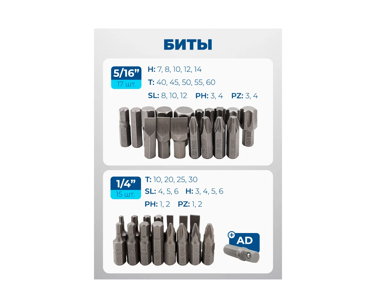 - Биты 5/16": H7, H8, H10, H12, H14; T40, T45, T50, T55, T60; SL8, SL10, SL12; PH3, PH4; PZ3, PZ4 - 17 шт.;