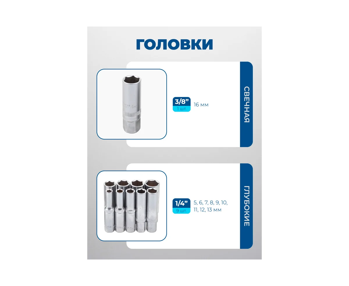 - Глубокие головки 5, 6, 7, 8, 9, 10, 11, 12, 13 мм. - 9 шт.;