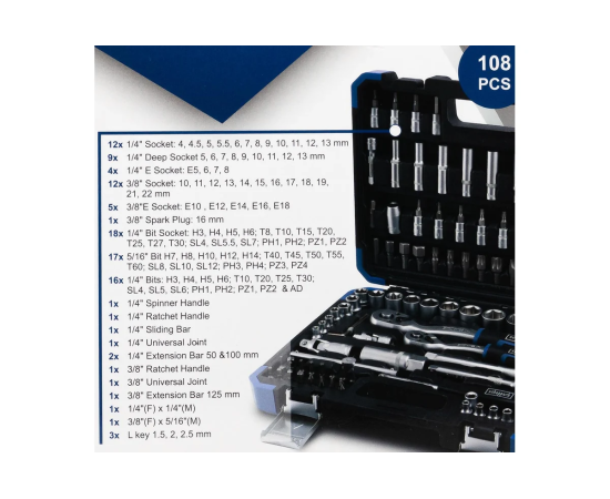 Многофункциональность. Набор из 108 предметов, включая торцевые головки различных размеров, свечные головки, головки-биты, удлинители, шарнирные карданы и шестигранные ключи. Это позволяет справиться с широким спектром задач — от обслуживания автомобиля до сборки мебели.