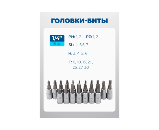 - Головки-биты 1/4": H3, H4, H5, H6; T8, T10, T15, T20, T25, T27, T30; SL4, SL5.5, SL7; PH1, PH2; PZ1, PZ2 - 18 шт.;