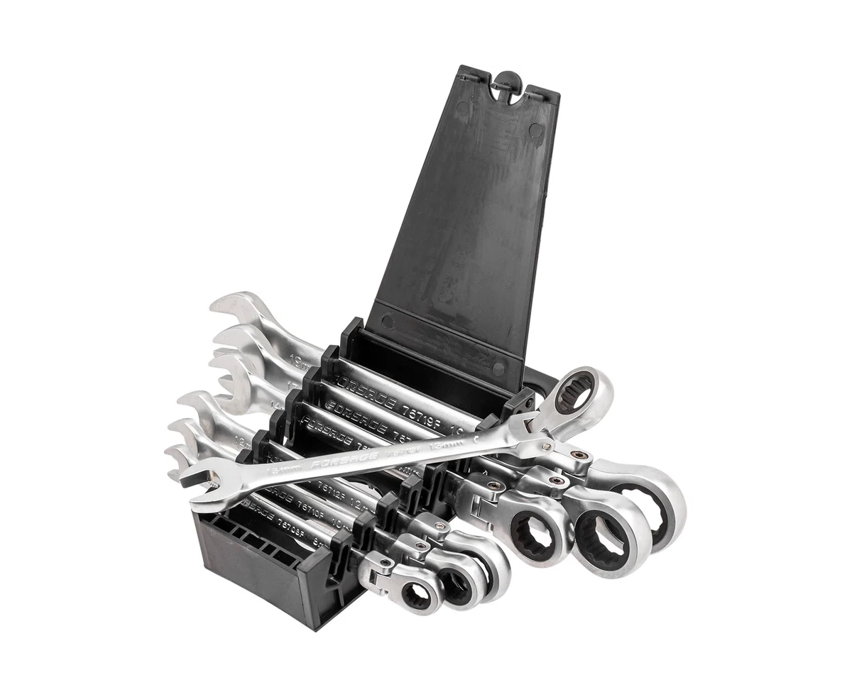 Набор трещоточных ключей с шарниром от бренда Forsage значительно упрощает выполнение монтажа, демонтажа и других работ. Этот набор сочетает в себе свойства рожковых и накидных ключей, что делает его универсальным инструментом для работы с крепежными элементами.