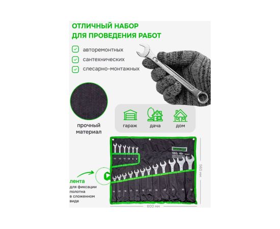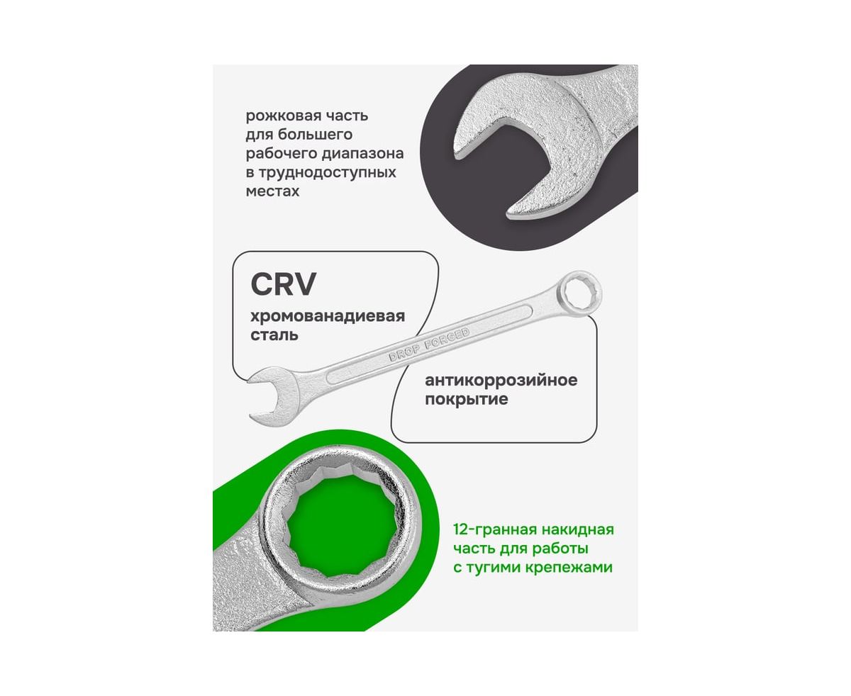 Набор комбинированных ключей - это незаменимый инструмент в любом профессиональном или домашнем наборе инструментов. Изготовленный из хромованадиевой стали, он обеспечивает надежное и прочное соединение болтов и гаек. Эргономичная форма ручки позволяет удобно работать с ключом, не утомляя руки. Не забудьте проверить соответствие размеров требуемой конструкции или механизма перед использованием. Используется как для производственных нужд, ремонта авто, так и для набора домашнего инструмента.