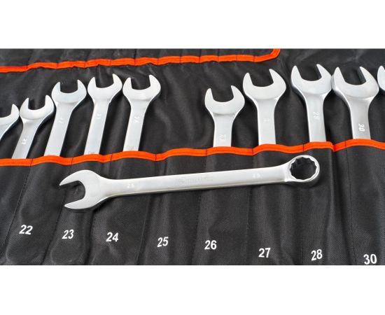 Набор комбинированных ключей используется для монтажа и демонтажа резьбовых соединений. Поставляется в практичном чехле, где каждый ключ находится в отдельном кармане.