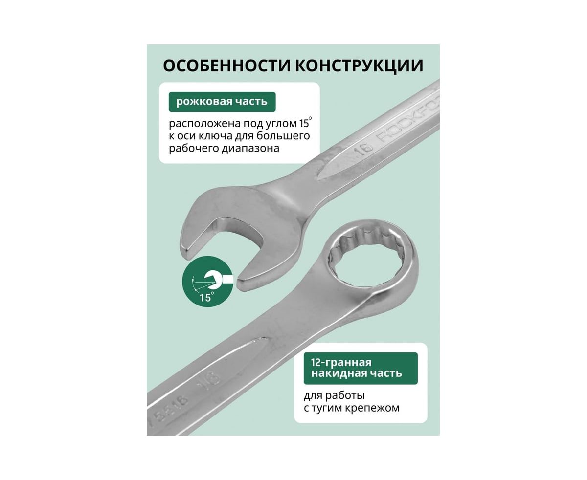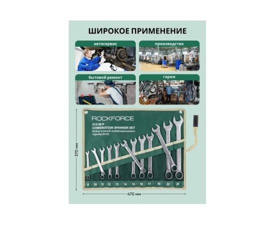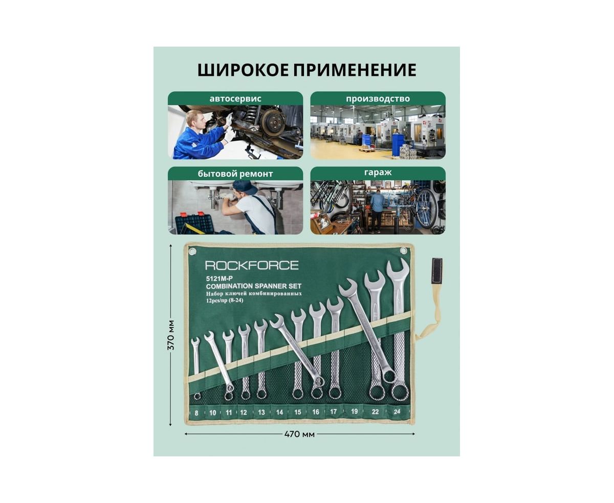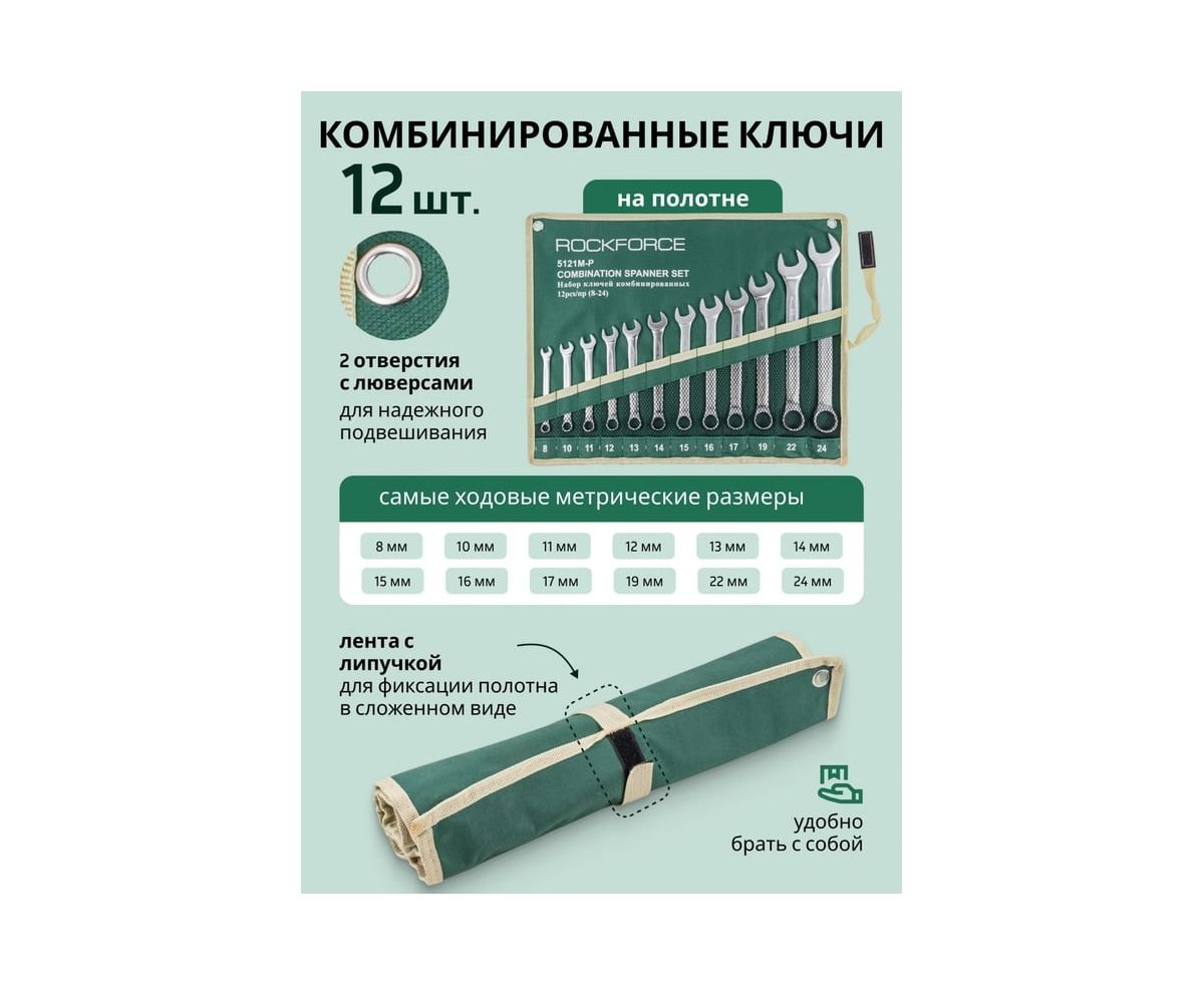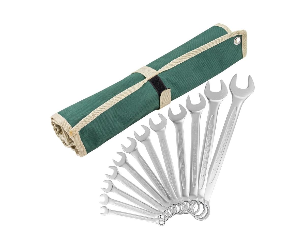 Набор комбинированных ключей 12 предметов на полотне от бренда ROCKFORCE- самый распространённый и популярный тип гаечного ключа, сочетающий в конструкции рожковый и накидной профили.