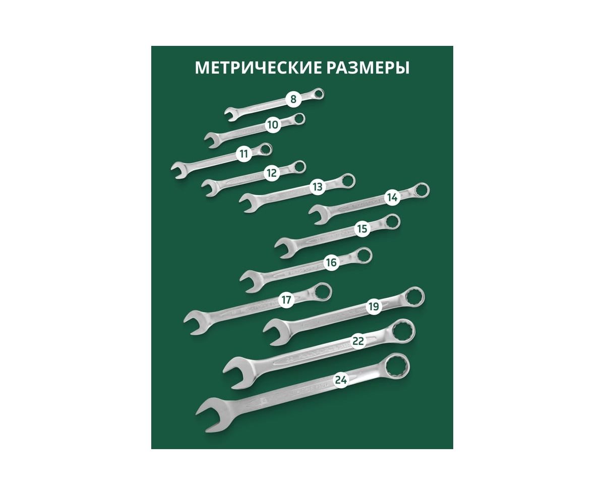 Набор включает в себя ключи 12 комбинированных ключей: 8, 10-17, 19, 22, 24 мм