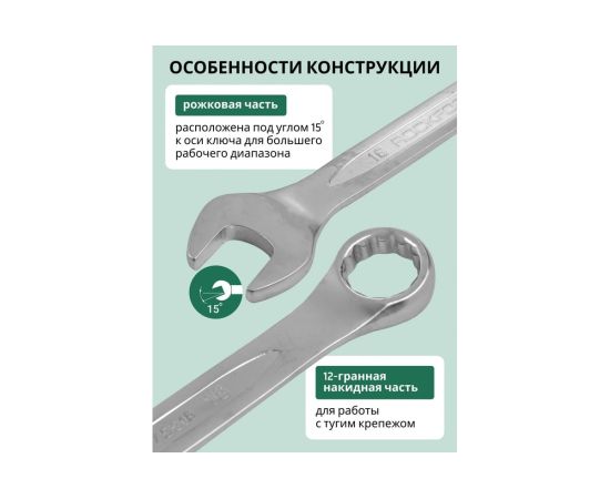 Рожковая сторона ключа подходит для работ с крепежом, доступ к которому есть лишь с одной стороны; а накидная часть для проведения работ с высоко нагруженными резьбовыми соединениями. Накидная часть имеет 12 граней.