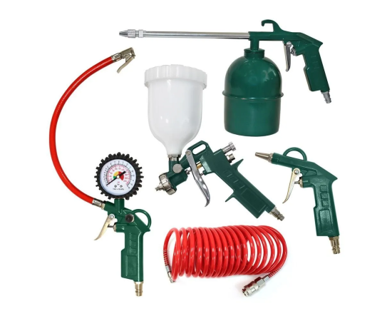 Набор пневмоинструмента AC 5KIT состоит из 5 предметов, предназначен для лакокрасочных работ, продувки загрязненных поверхностей сжатым воздухом, подкачки шин. Пистолет продувочный предназначен для выполнения работ по очистке поверхности от грязи, пыли и прочих загрязнений. Пистолет для накачивания шин с манометром предназначен для подкачки и проверки давления в автомобильных, велосипедных и других шинах с подходящим соединением. Моющий пистолет предназначен для применения в качестве моющего пистолета для промывки различного рода поверхностей. Возможно применение для нанесения вязких жидкостей, в том числе и мовиля для антикорозийной обработки автомобиля. Пневматический спиральный шланг предназначен для соединения пневмоинструмента с компрессором. Краскораспылитель предназначен для нанесения лака и краски, а также содержащих растворители и разводимых водой эмалевых красок, лаков, покрывных лаков для автомобилей, морилок и прочих текучих материалов посредством сжатого воздуха.