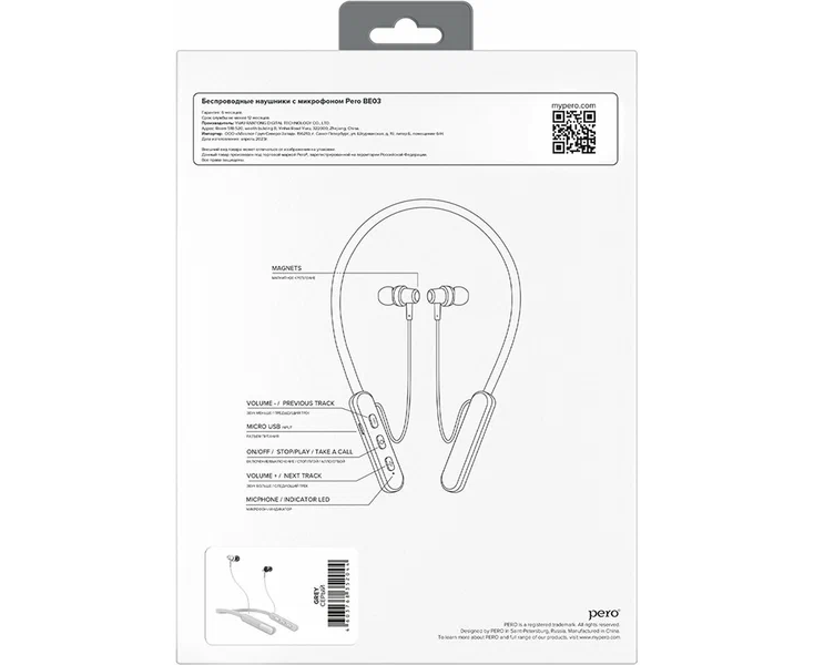 Наушники беспроводные PERO BE03 Sportlife (PWH-BE03GR) Grey, вакуумные