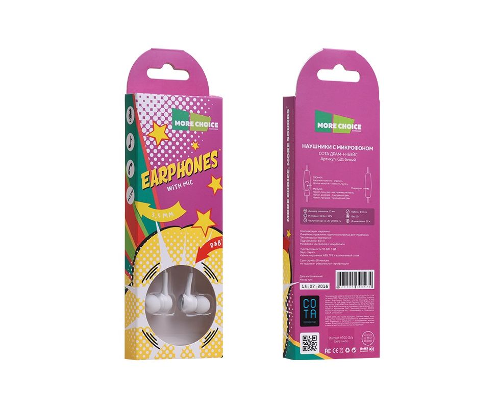 Наушники вакуумные AUX разъём с МК и рег.громкости длина 1.2м More choice G21 (White)