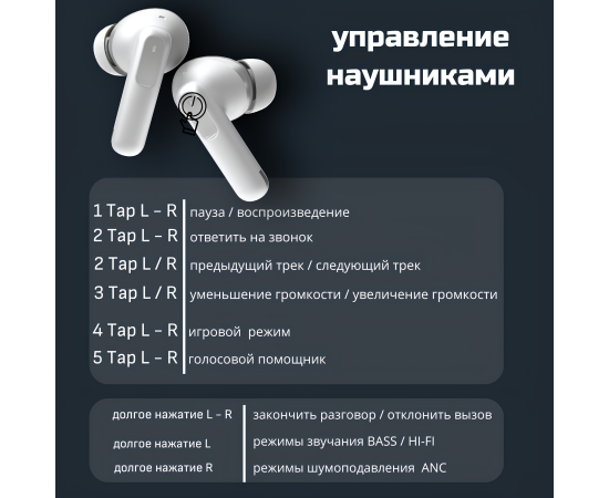 кнопка play/pause, кнопка приема вызова, кнопки переключения треков, активация голосового помощника, регулировка шумоподавления