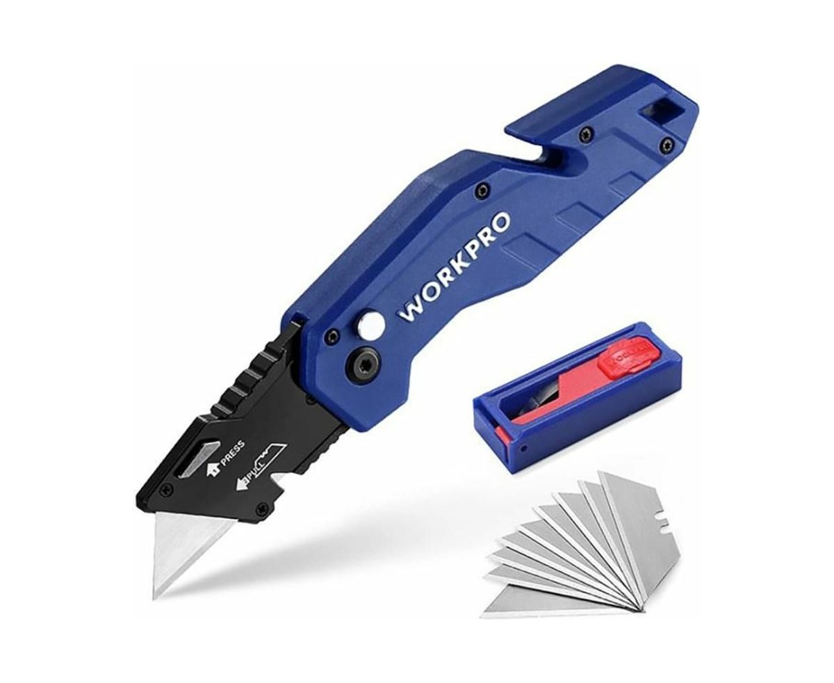 Складной быстросменный нож WORKPRO с нейлоновой рукояткой, 10 лезвий, трапециевидные лезвия WP211008 используется для резки ковра, бумаги, пластика, кожи, картона, алюминиевого листа и др. Специальный механизм обеспечивает быструю смену лезвий. Острое закаленное лезвие выполнено из стали SK5, обладающей высокой прочностью и долговечностью. Зажим для ремня служит для удобной носки ножа на ремне брюк. Нейлоновая рукоятка обладает стойкостью к износу, легким весом и эргономичной формой.