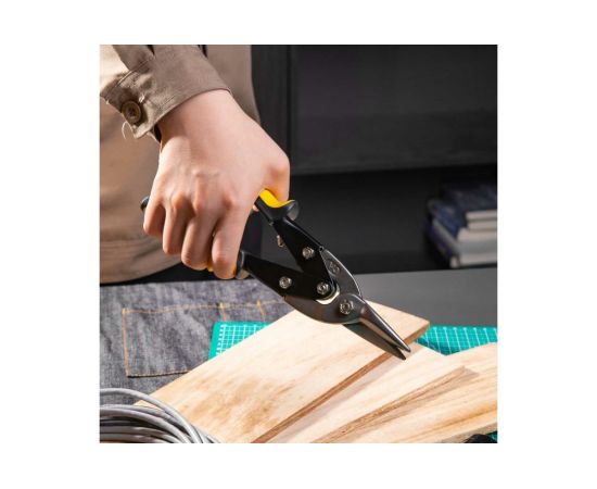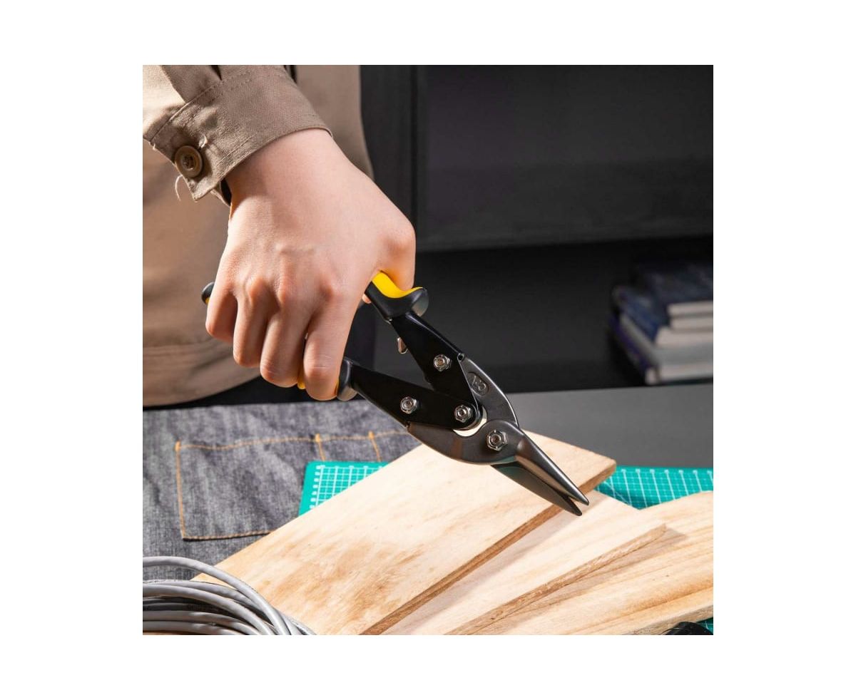 Ножницы по металлу используются в мастерских, на производствах, при проведении ремонтных работ и предназначены для разрезания листов из цветных металлов, холоднокатаной или нержавеющей стали. Рабочие части изготовлены из высокопрочной хромованадиевой стали и обладают высокой твердостью, что определяет длительный срок службы инструмента. Двухкомпонентная эргономичная рукоятка имеет упоры для пальцев. Это обеспечивает надежный захват материала без проскальзывания.
