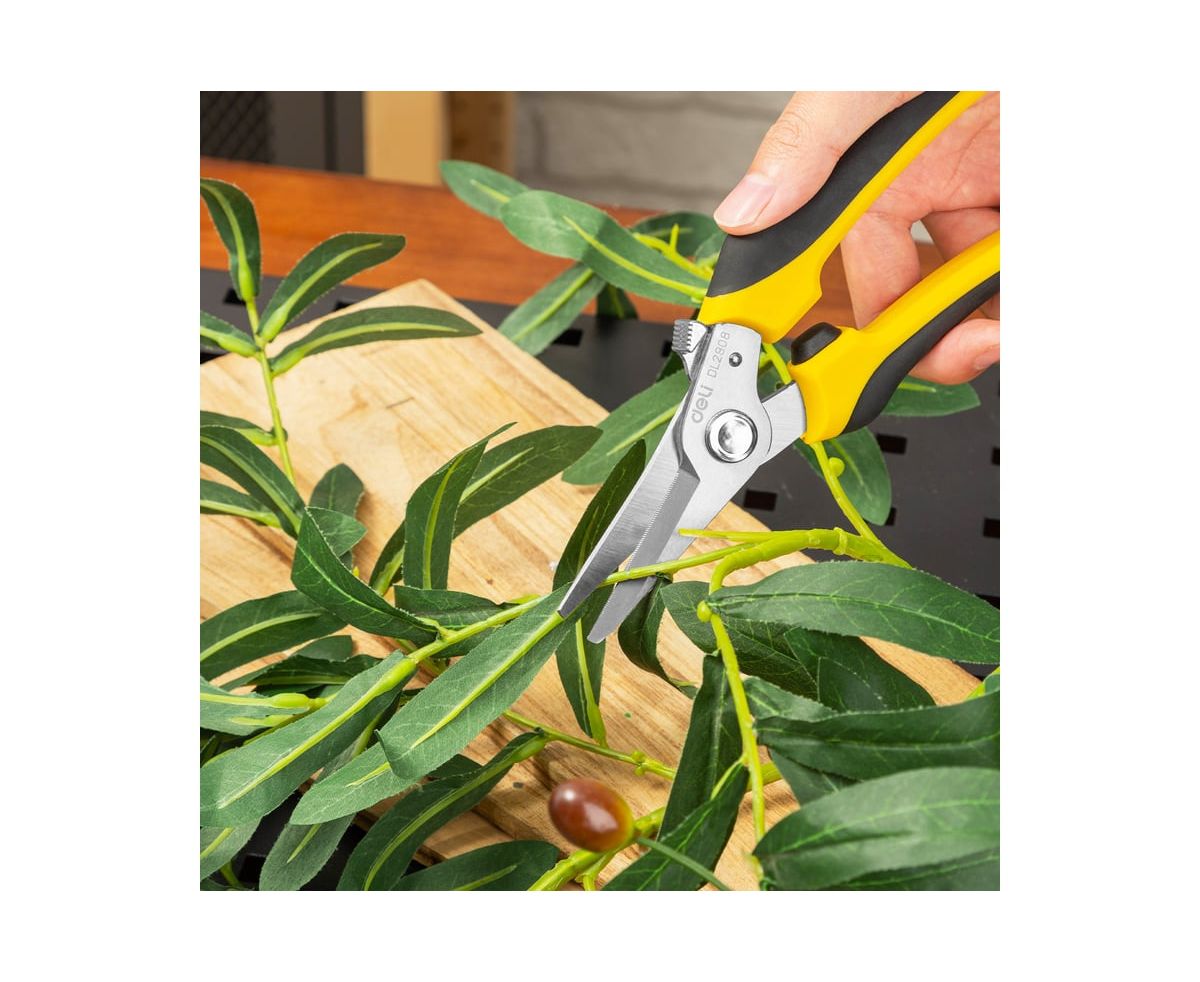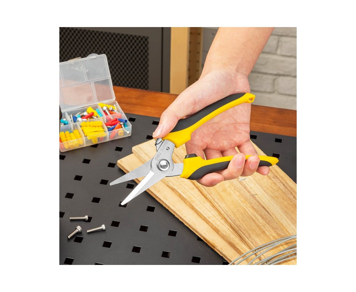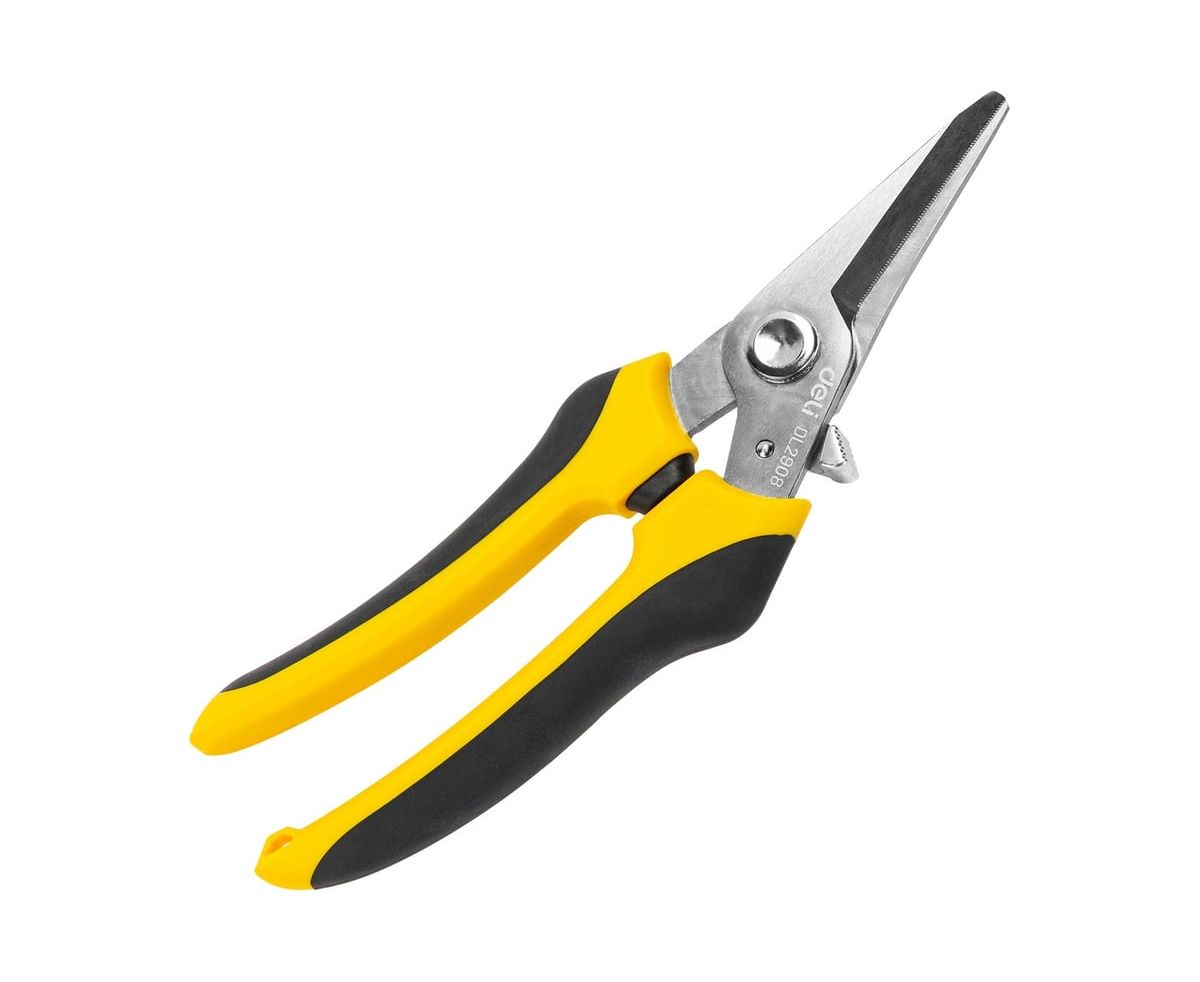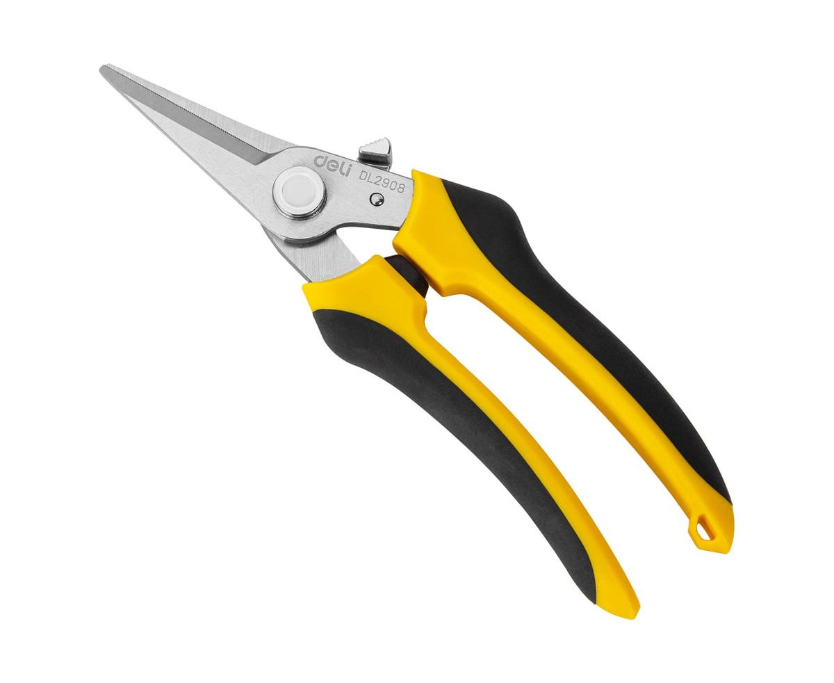 Универсальные строительные ножницы DELI DL2908 205 мм, кованая нержавеющая сталь, прорезиненная рукоять 118993 используются для различных работ - зачистка кабелей и проводов, раскрой кожи или ткани, обрезка ветвей растений и кустарников, может перерезать канат или металлическую проволоку диаметром до 0.5 мм и много другое.