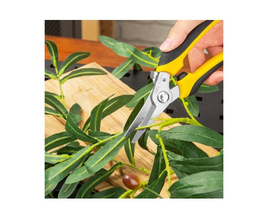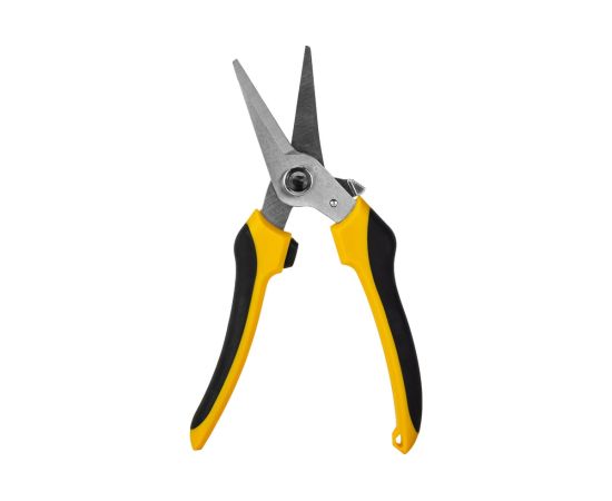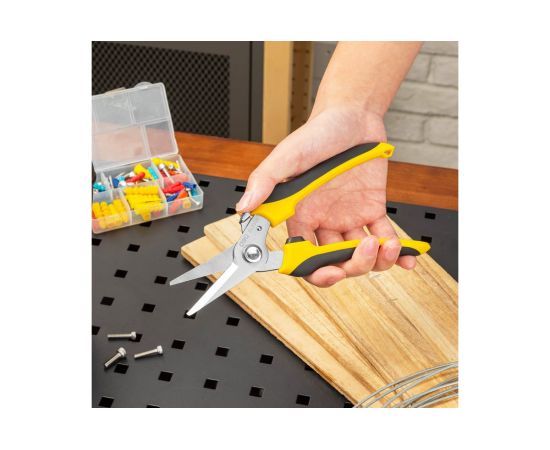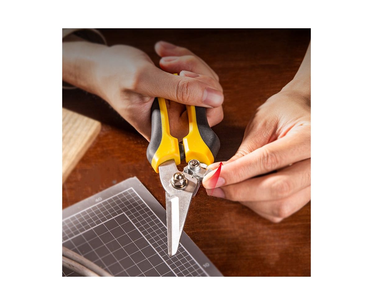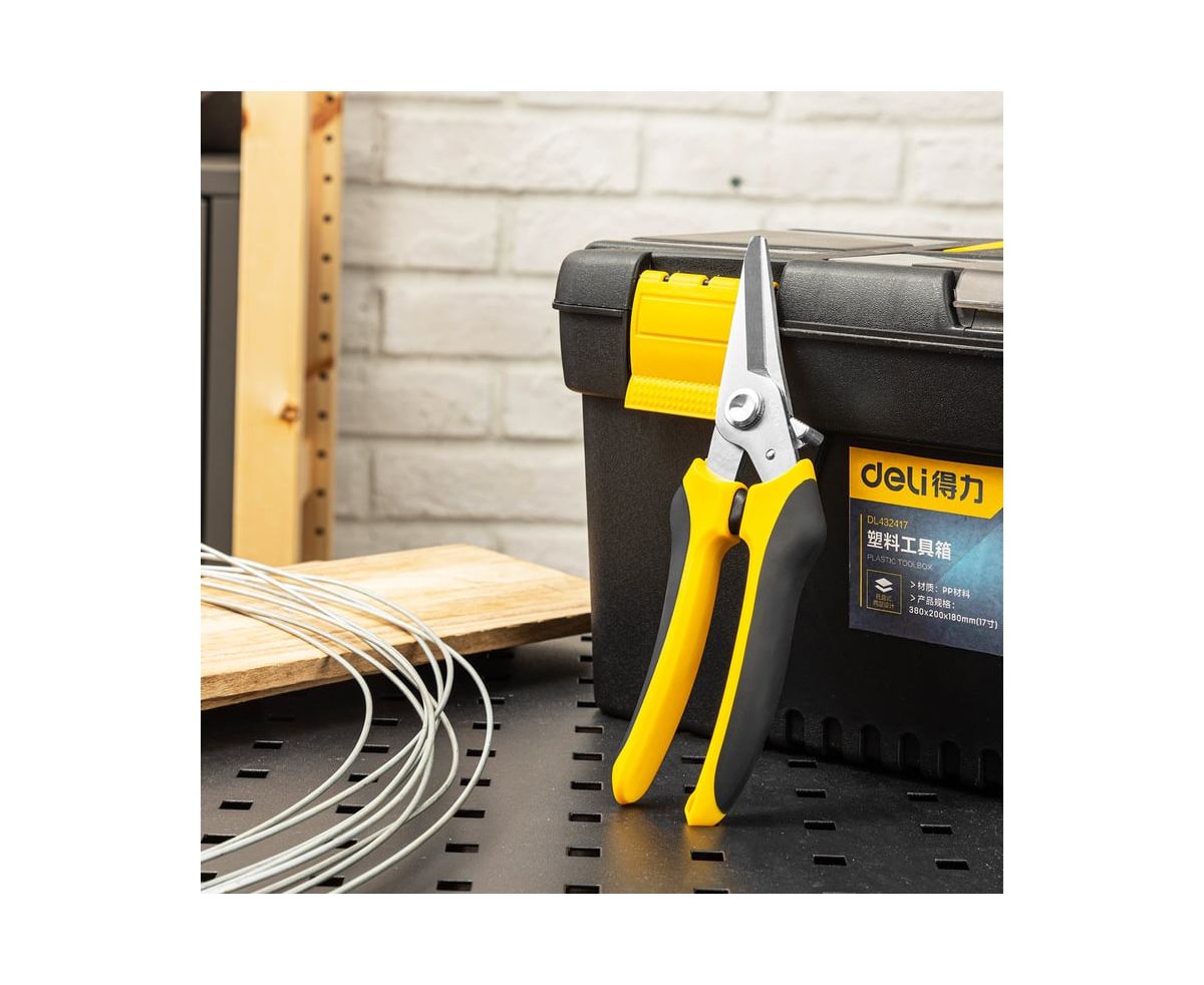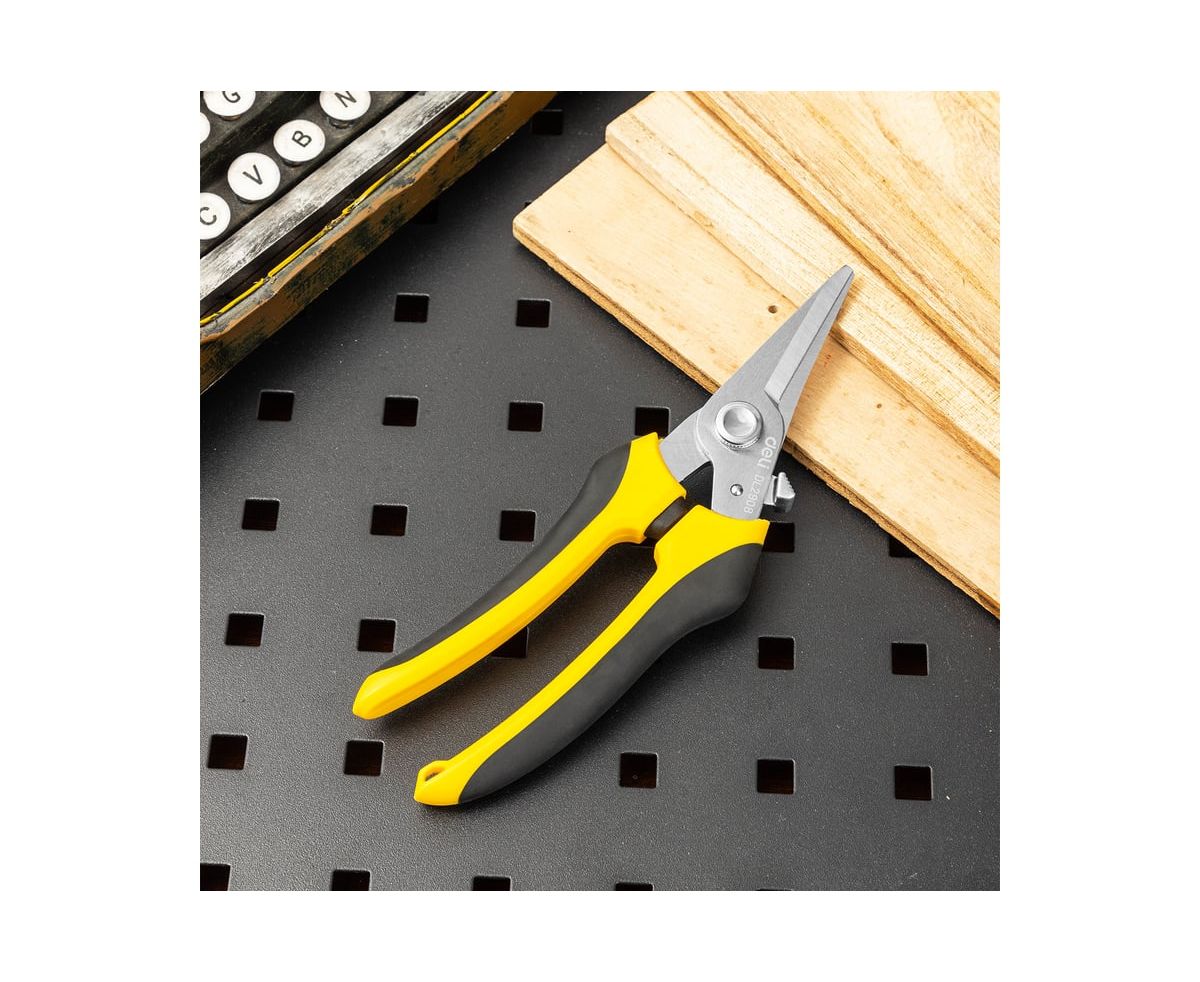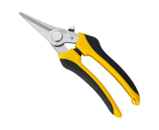 Универсальные строительные ножницы DELI DL2908 205 мм, кованая нержавеющая сталь, прорезиненная рукоять 118993 используются для различных работ - зачистка кабелей и проводов, раскрой кожи или ткани, обрезка ветвей растений и кустарников, может перерезать канат или металлическую проволоку диаметром до 0.5 мм и много другое.