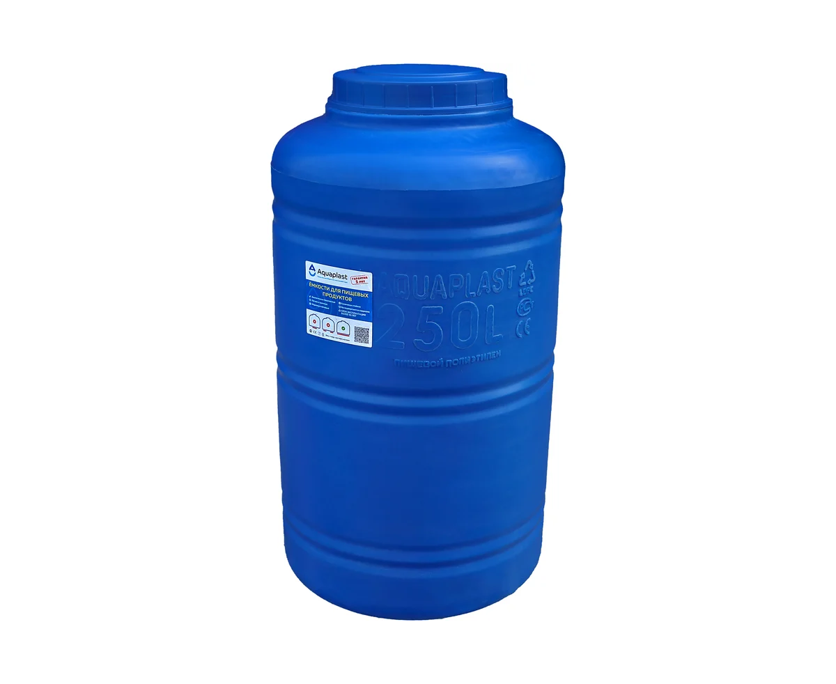 Овально-вертикальная емкость AQUAPLAST 250 л, синяя 4630017951802 предназначен для стационарного хранения питьевой воды, пищевых продуктов, агрессивных сред (по согласованию), дизельного топлива.