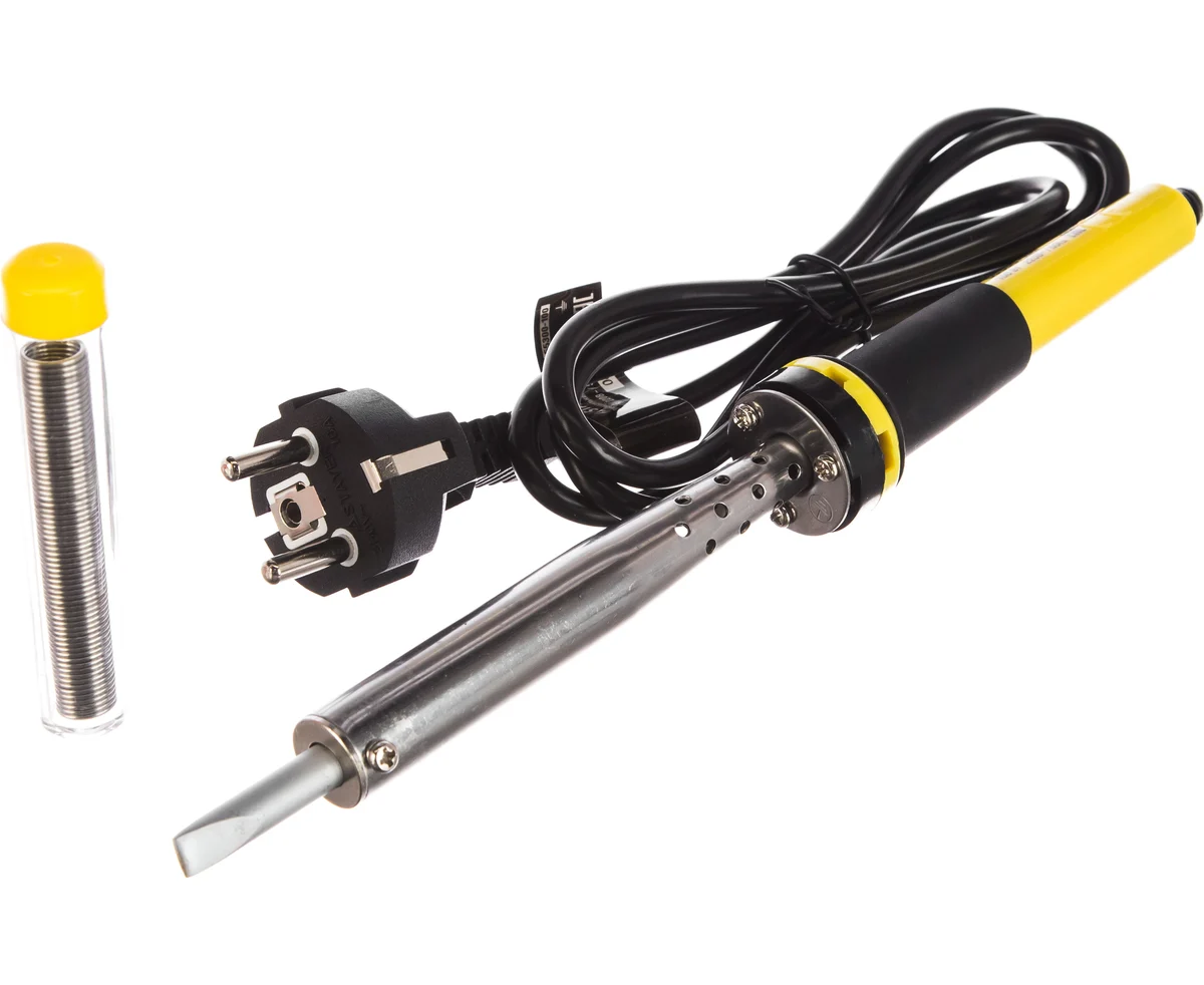 Паяльник с двухкомпонентной рукояткой и долговечным жалом, в комплекте припой и подставка, 100Вт, клин STAYER PROFI 55300-100 - надежный и долговечный электрический прибор, выполненный из высококачественных современных материалов, который служит для напаивания электронных компонентов на печатную плату, пайки и лужения медных проводников, а также отпайки различных деталей.