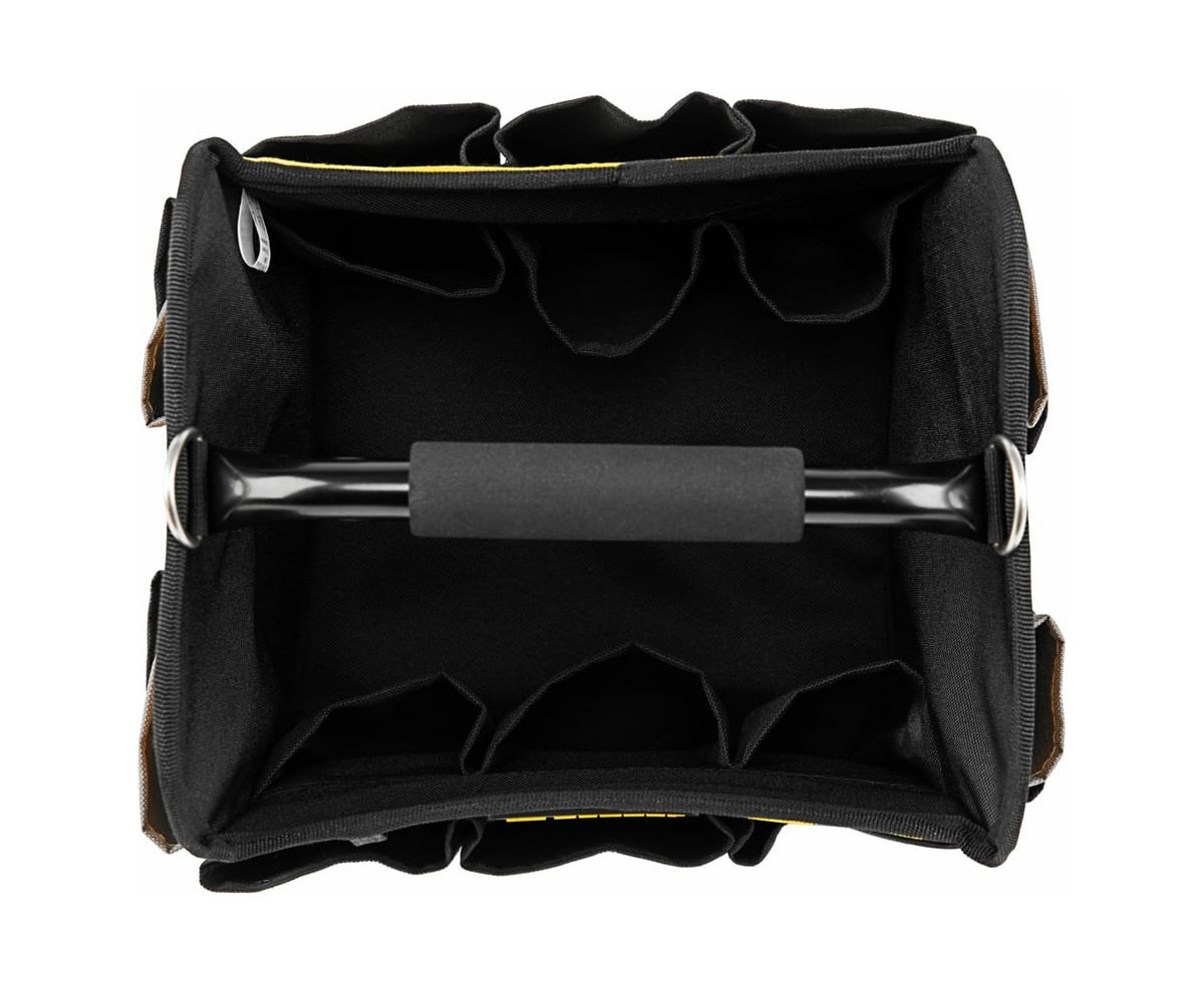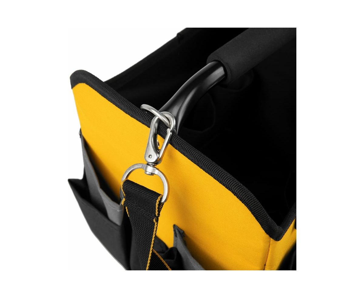 Переноска для инструмента Denzel 260x240x300 мм, 22 кармана, наплечный ремень 90294 предназначена для транспортировки и хранения ручного инструмента. Множество внешних и внутренних карманов удобны для быстрого доступа к нужному инструменту, а также позволяют оптимизировать пространство переноски. Переноска оснащена стальной рукояткой с неопреновой круглой накладкой, а также плечевым ремнем с возможностью регулировки длины (широкая подвижная накладка для удобства). Данная модель удобна, как при выездных работах, так и для хранения инструмента, например, дома, в машине, на даче или в гараже. Материал переноски - плотный полиэстер (600 D), устойчивый к истиранию. Конструкция сумки усилена боковым каркасом. На дне сумки с внешней стороны установлены пять пластиковых сферических подставок. В случае необходимости, стальные карабины на плечевом ремне позволяют быстро отсоединять его от переноски. Длина плечевого ремня 1350 мм.