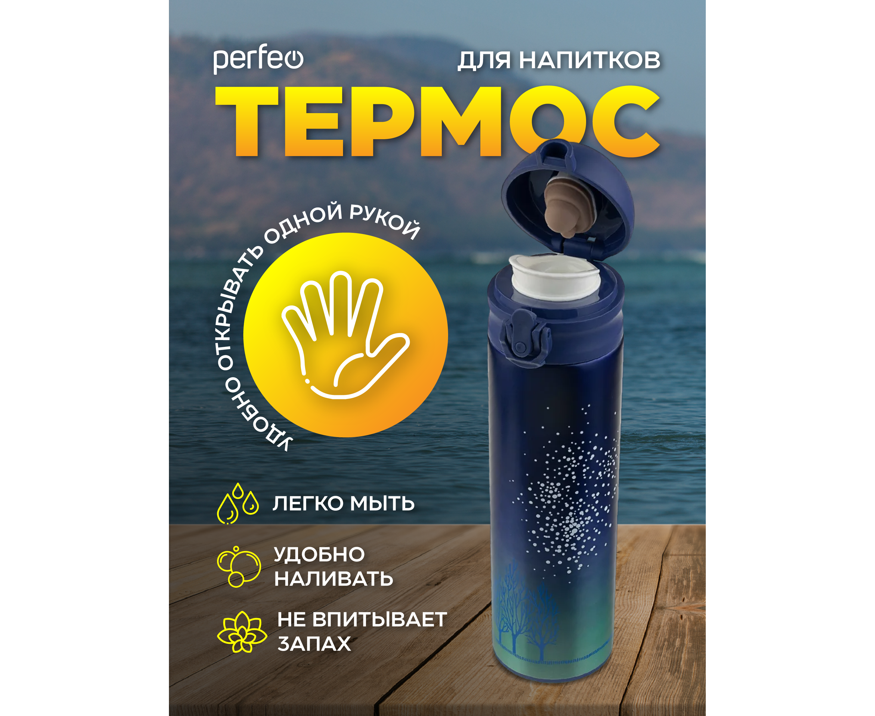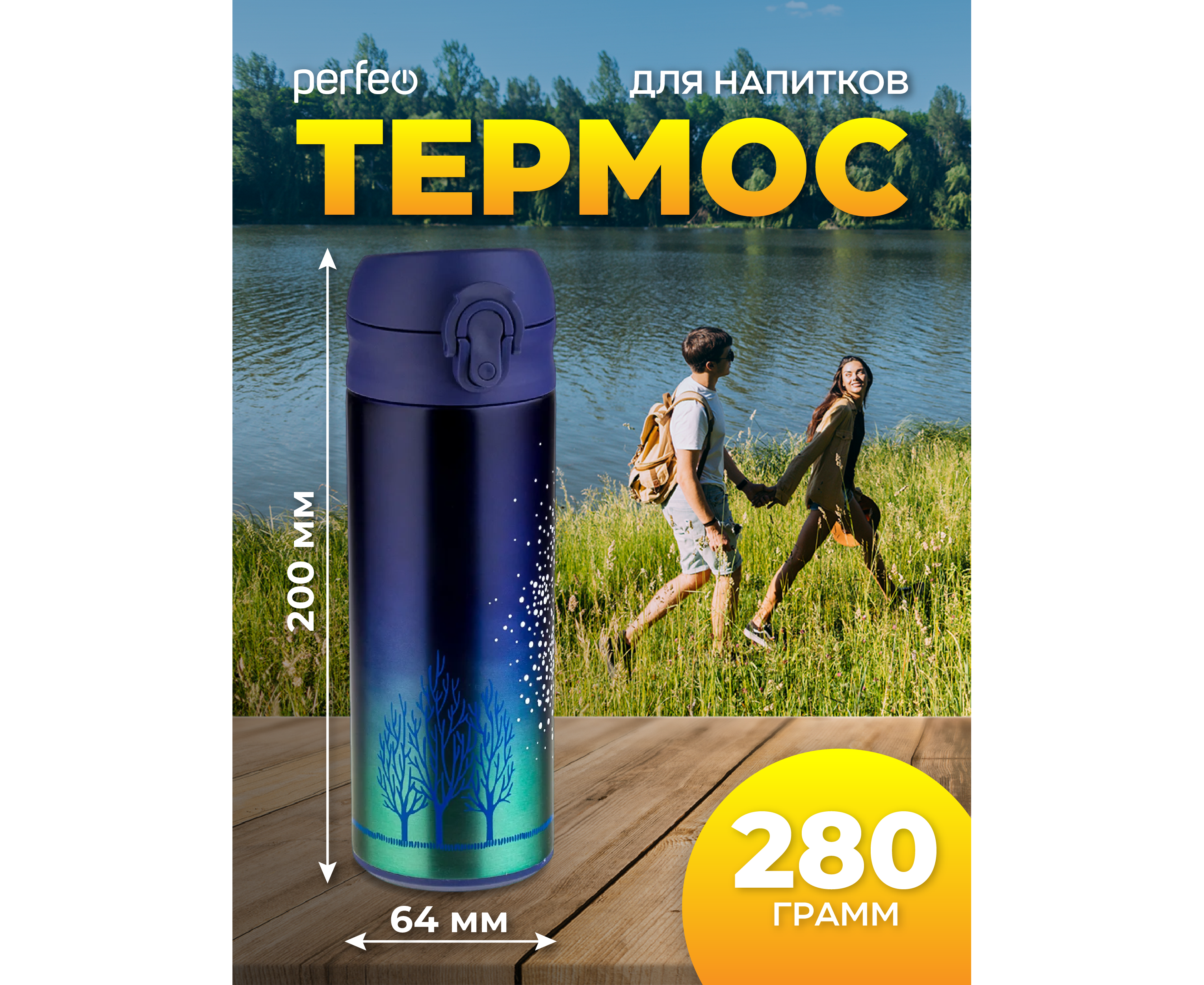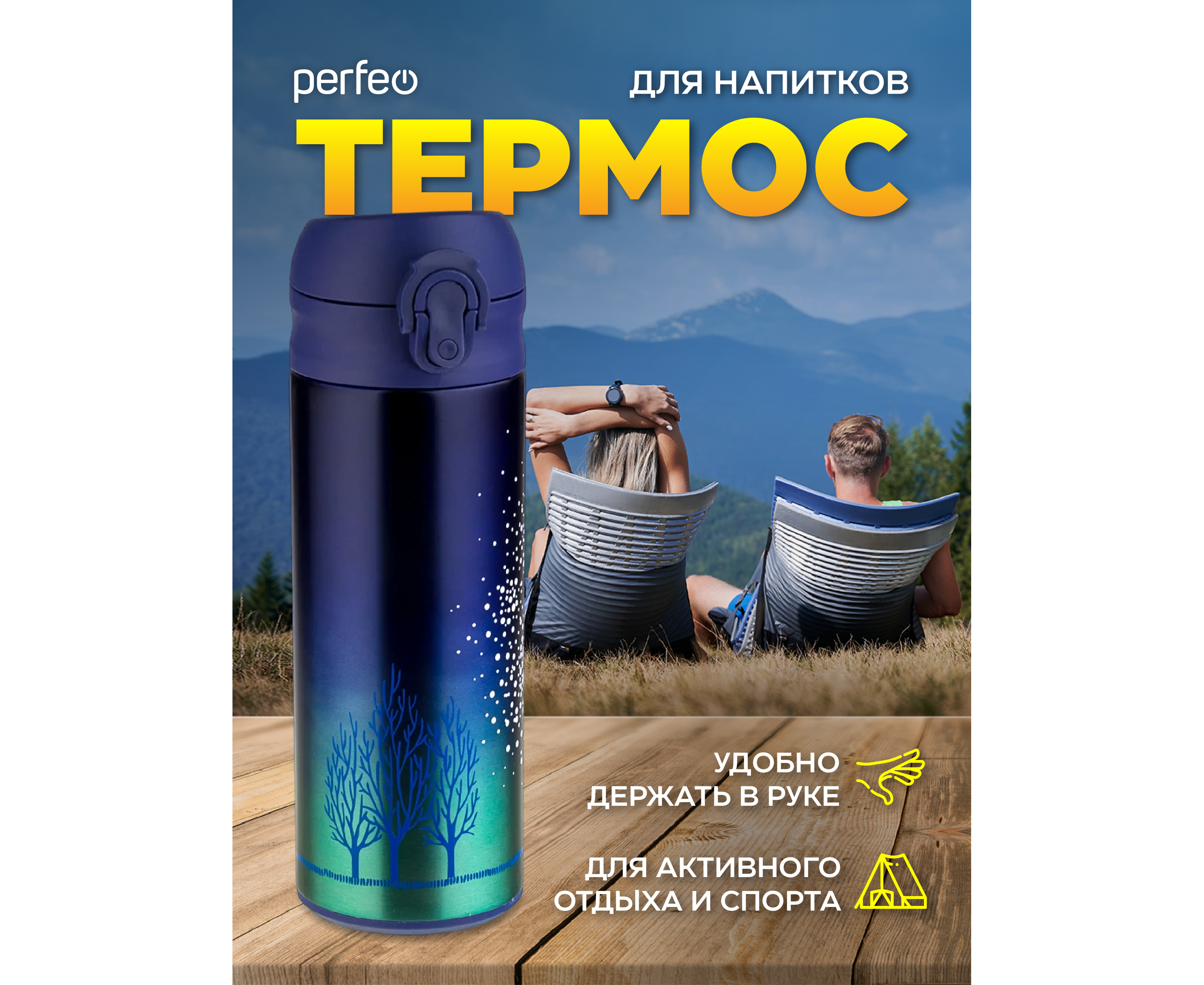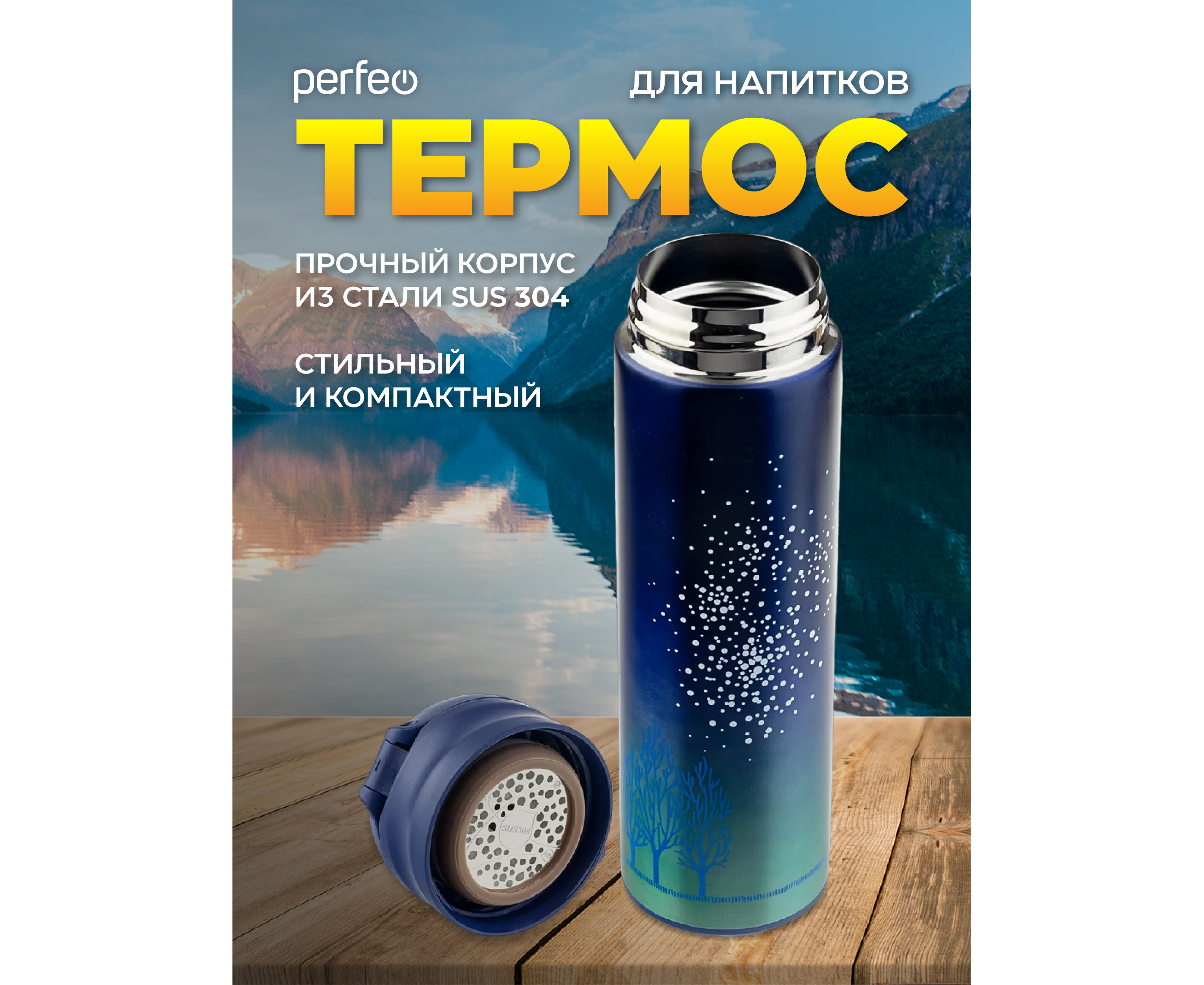 Термос для напитков PERFEO с крышкой-поилкой, ситечком, объем 0,35 л., звездное небо, (Арт. PF_C3716)