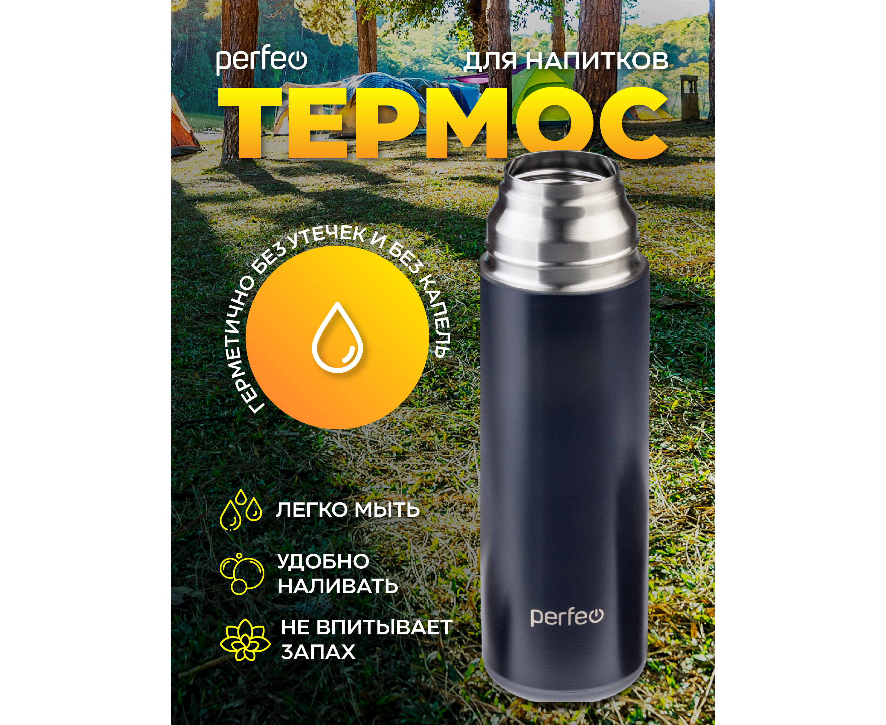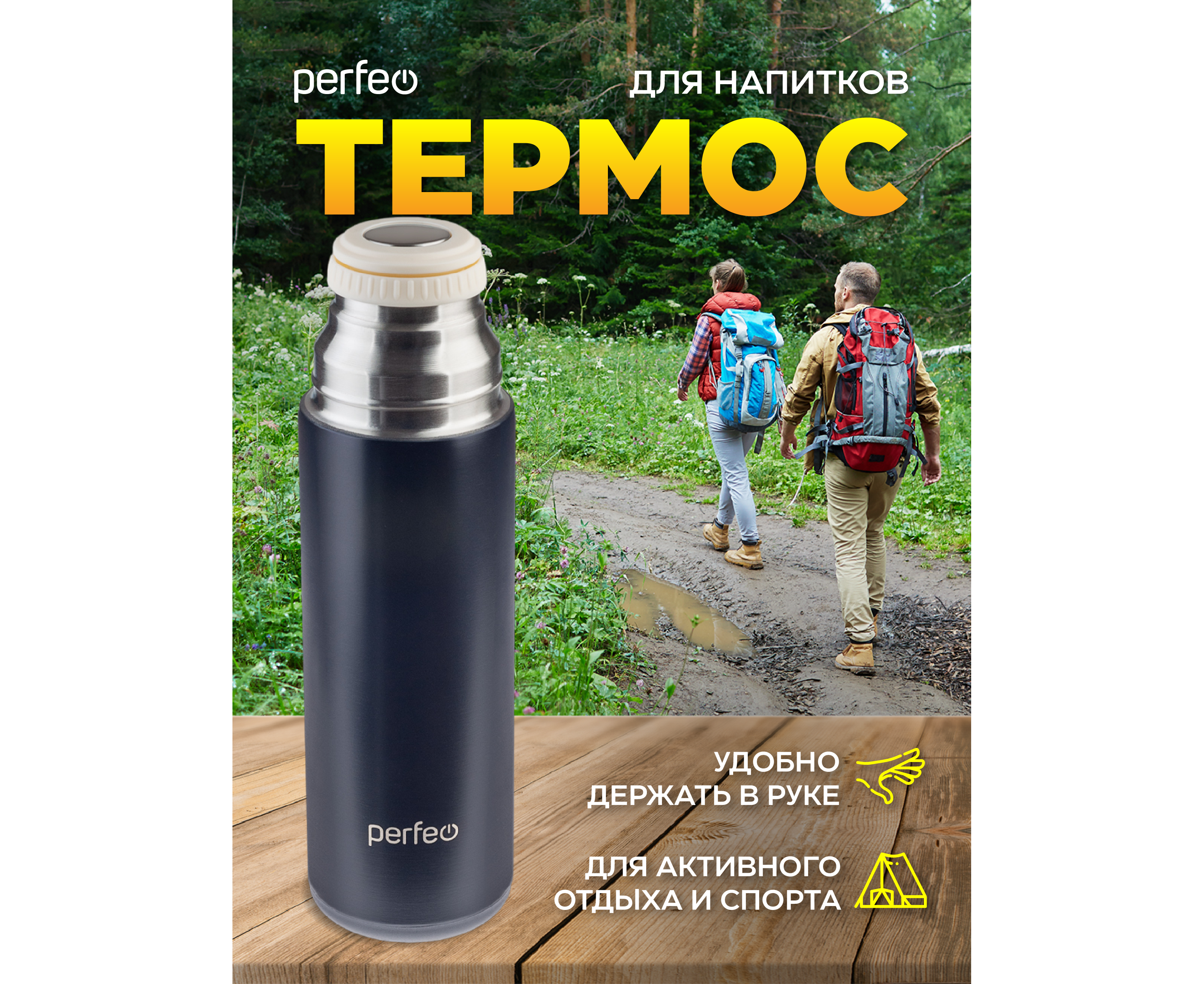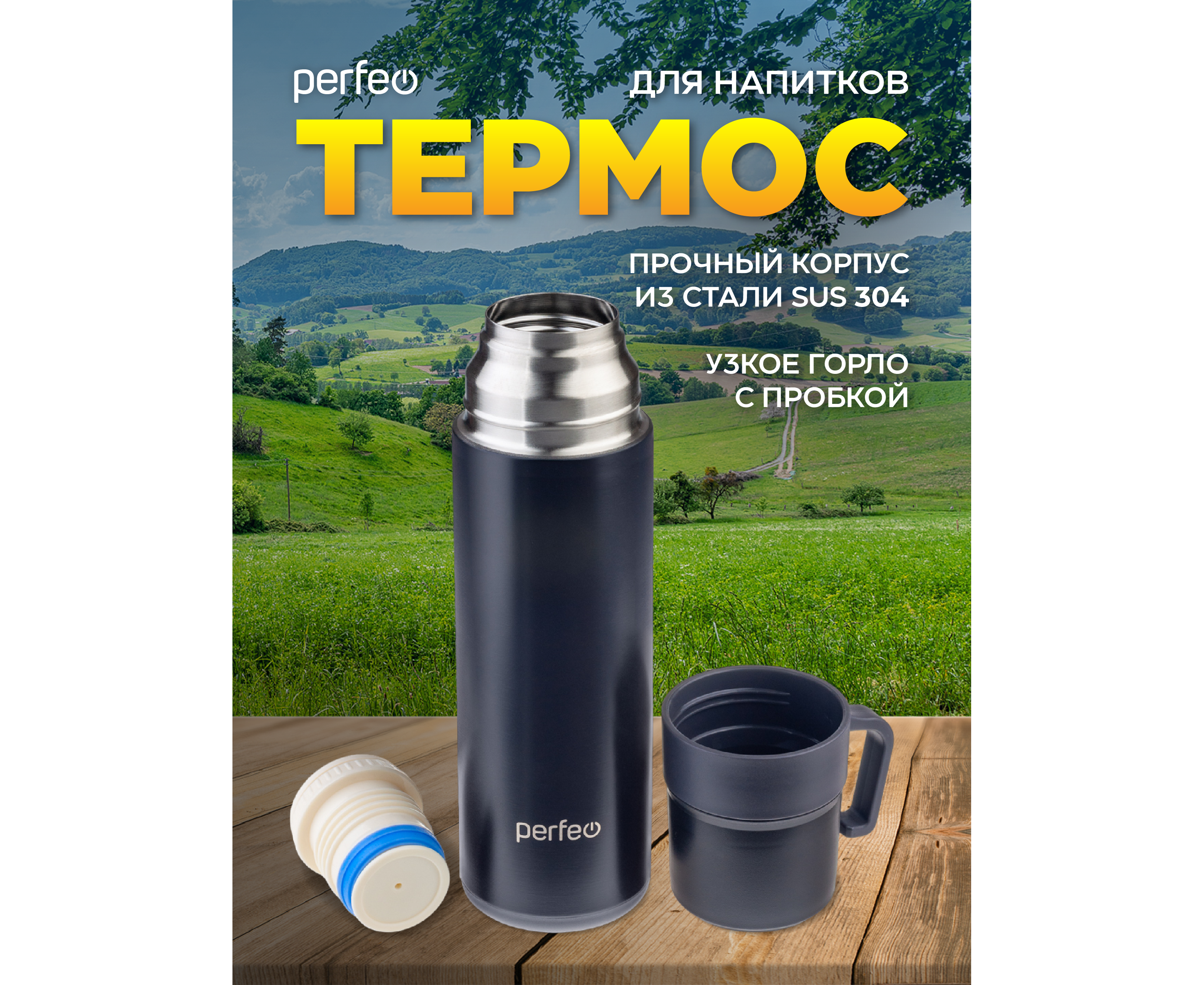 Термос для напитков PERFEO с пробкой-кнопкой, кружкой, объем 0,6 л., черный, (Арт. PF_D0204)