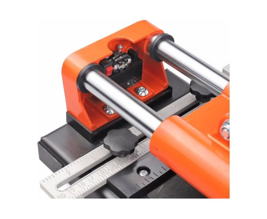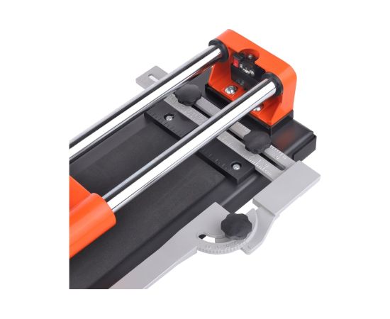 Модель имеет линейку-угольник для резки плитки под углом 30-45-60°, регулировки размера, дополнительной фиксации отрезаемой заготовки и точного положения плитки.
