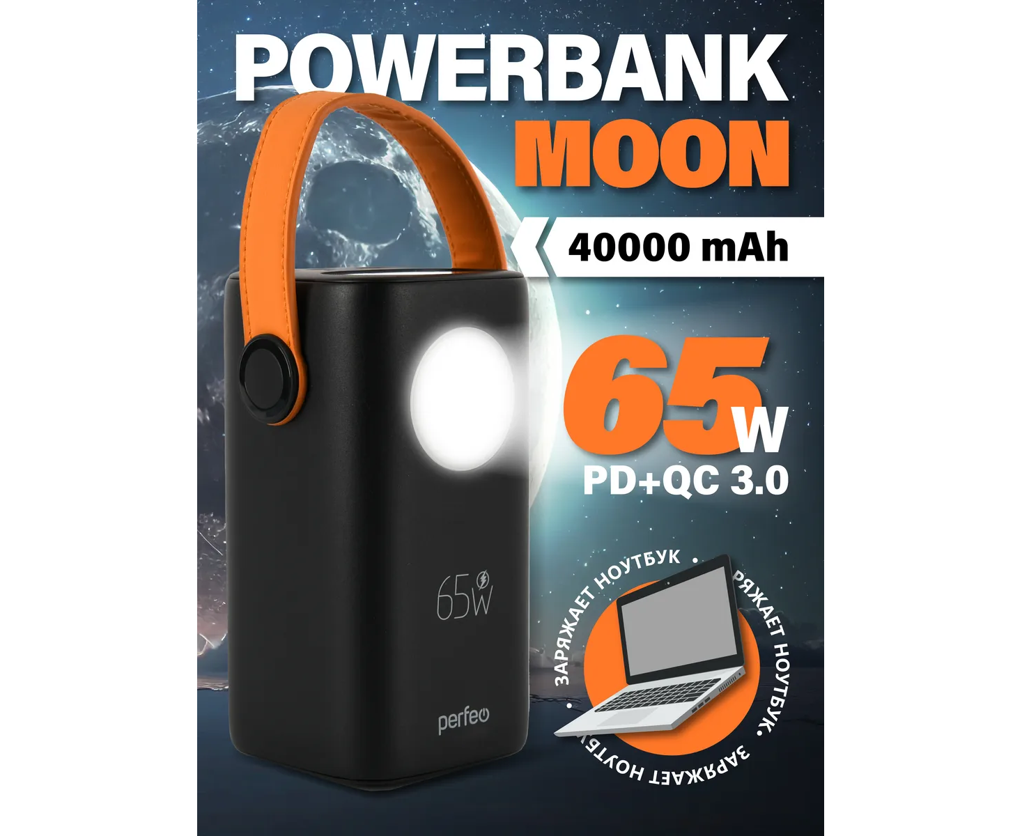 Модель Perfeo Powerbank MOON 65W 40000 mAh/LED дисплей/PD+QC 3.0/2Type-C/2 USB/Выход:5A,max 65W