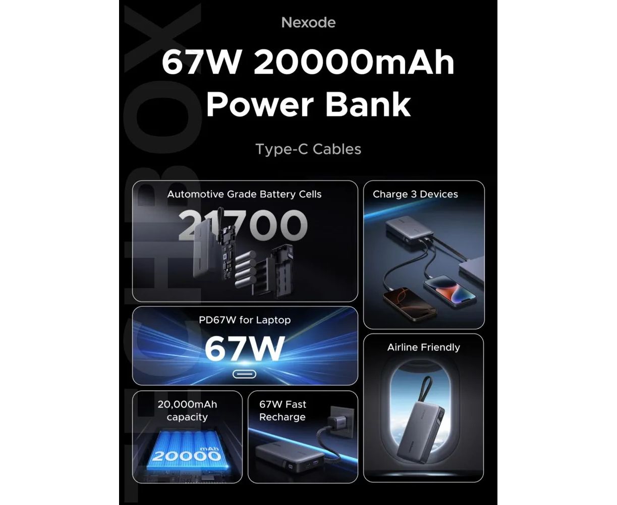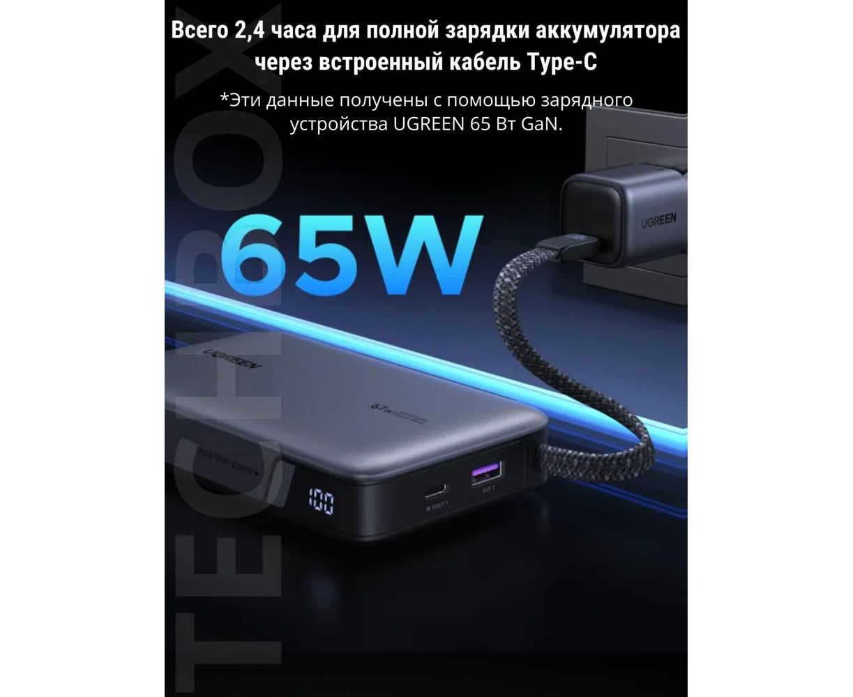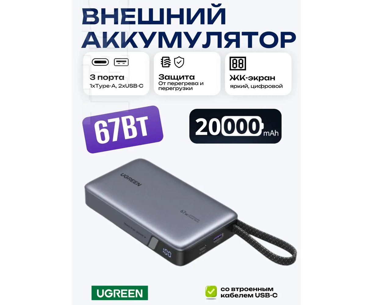 Внешний аккумулятор Ugreen PB550 (55996B) с емкостью АКБ 20000mAh предлагает идеальное решение для зарядки ваших устройств в любое время и в любом месте. Оснащённый функцией быстрой зарядки, он поддерживает технологии Power Delivery и предоставляет мощность до 67W, что позволяет вам быстро восстановить заряд вашего смартфона, планшета или другого устройства.