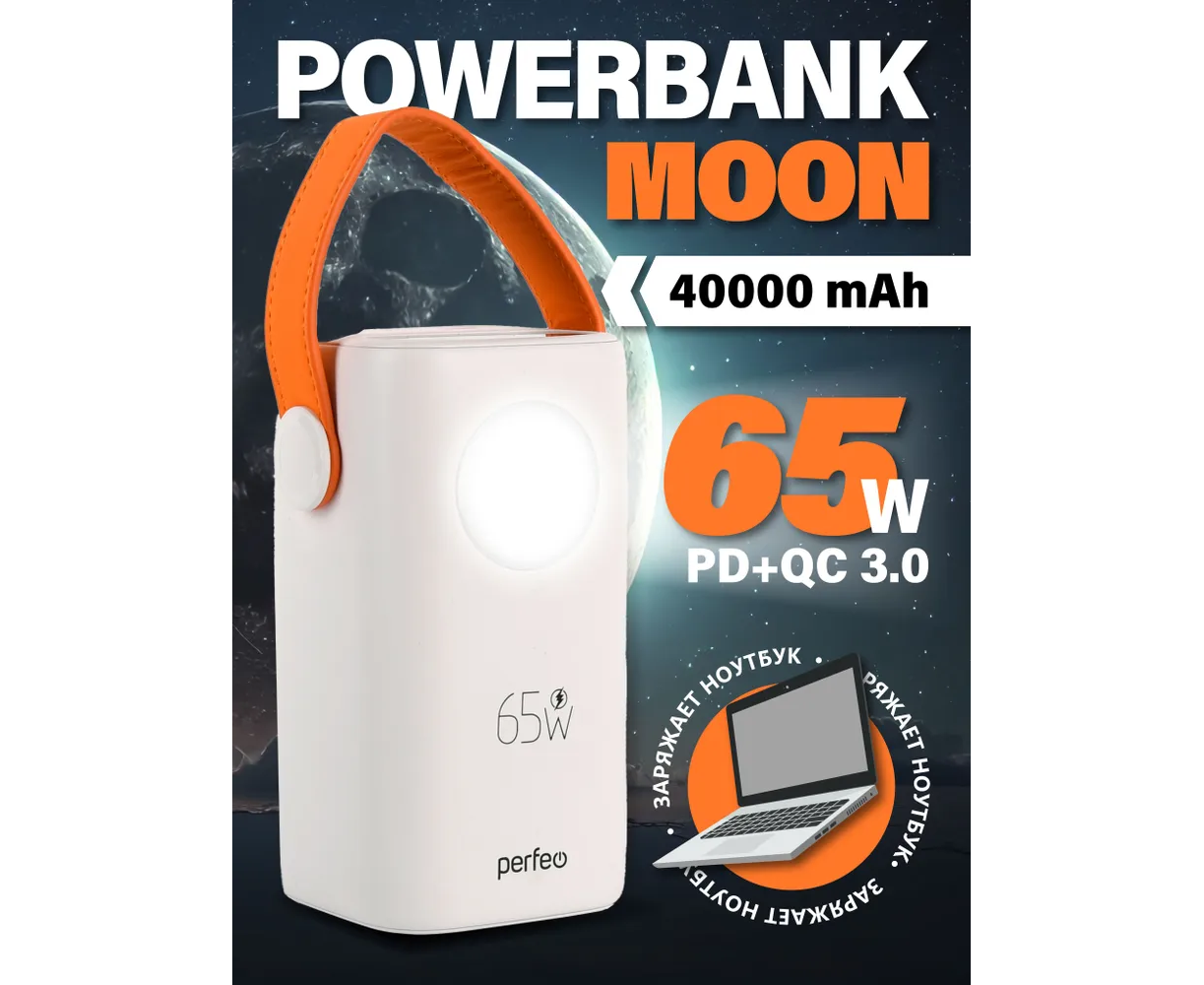 Powerbank Perfeo PF_E1635 Moon 65W 40000 mAh/LED дисплей/PD+QC 3.0/2Type-C/2 USB/,max 65W/White