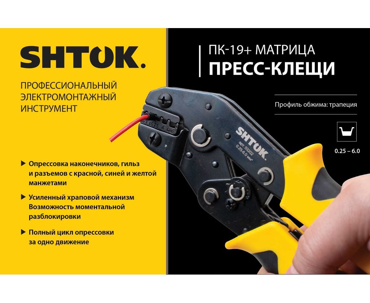 Пресс-клещи SHTOK ПК-19+ (03202) матрица, профиль трапеция, 0.25 - 6.0 мм