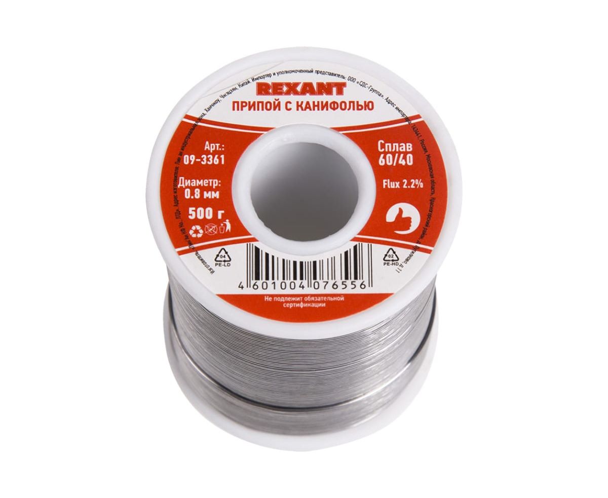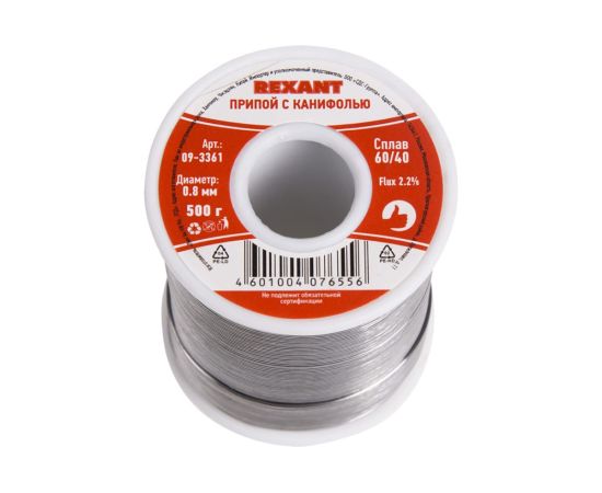 Припой с канифолью REXANT представляет собой проволоку (диаметром 0,8 мм) из сплава олова (60 %) и свинца (40 %).