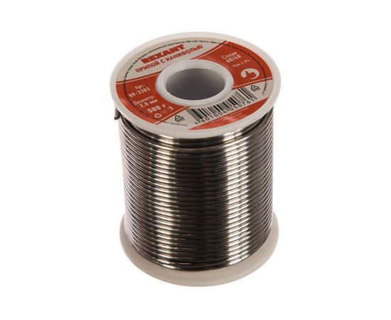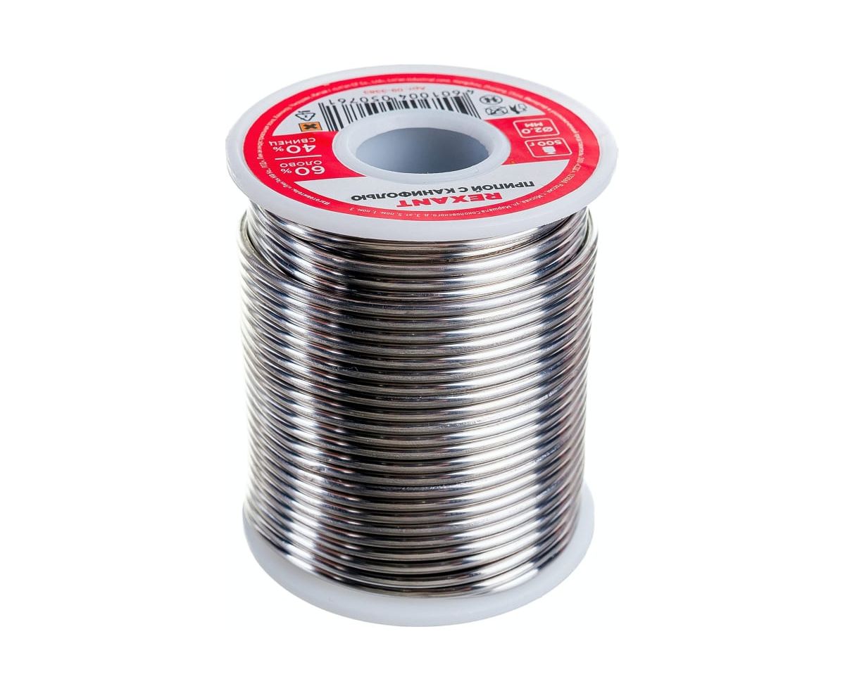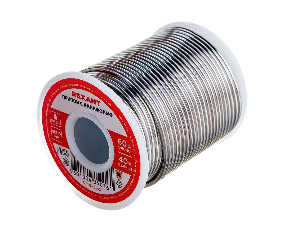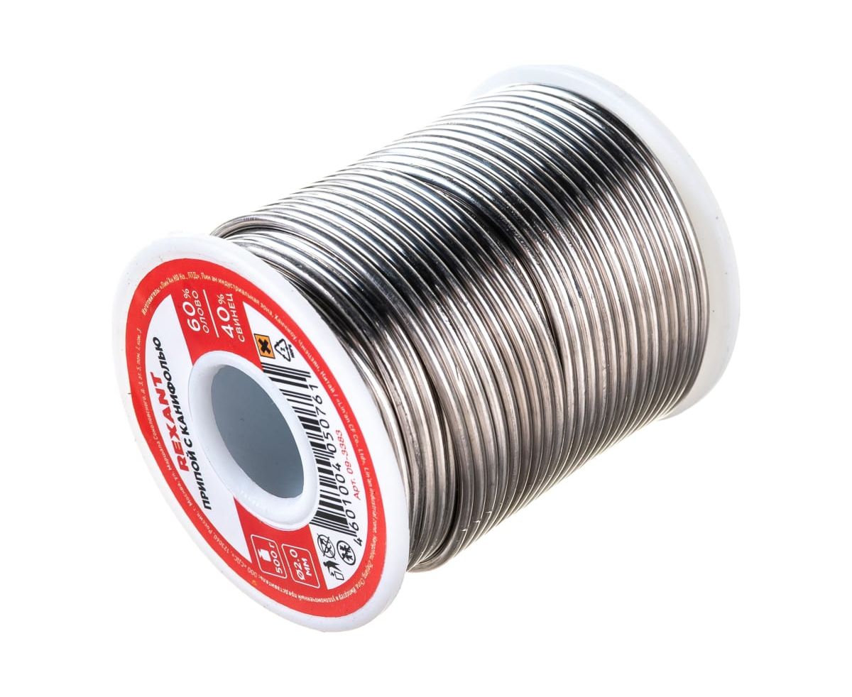Припой с канифолью REXANT представляет собой проволоку (диаметром 2 мм) из сплава олова (60 %) и свинца (40 %).