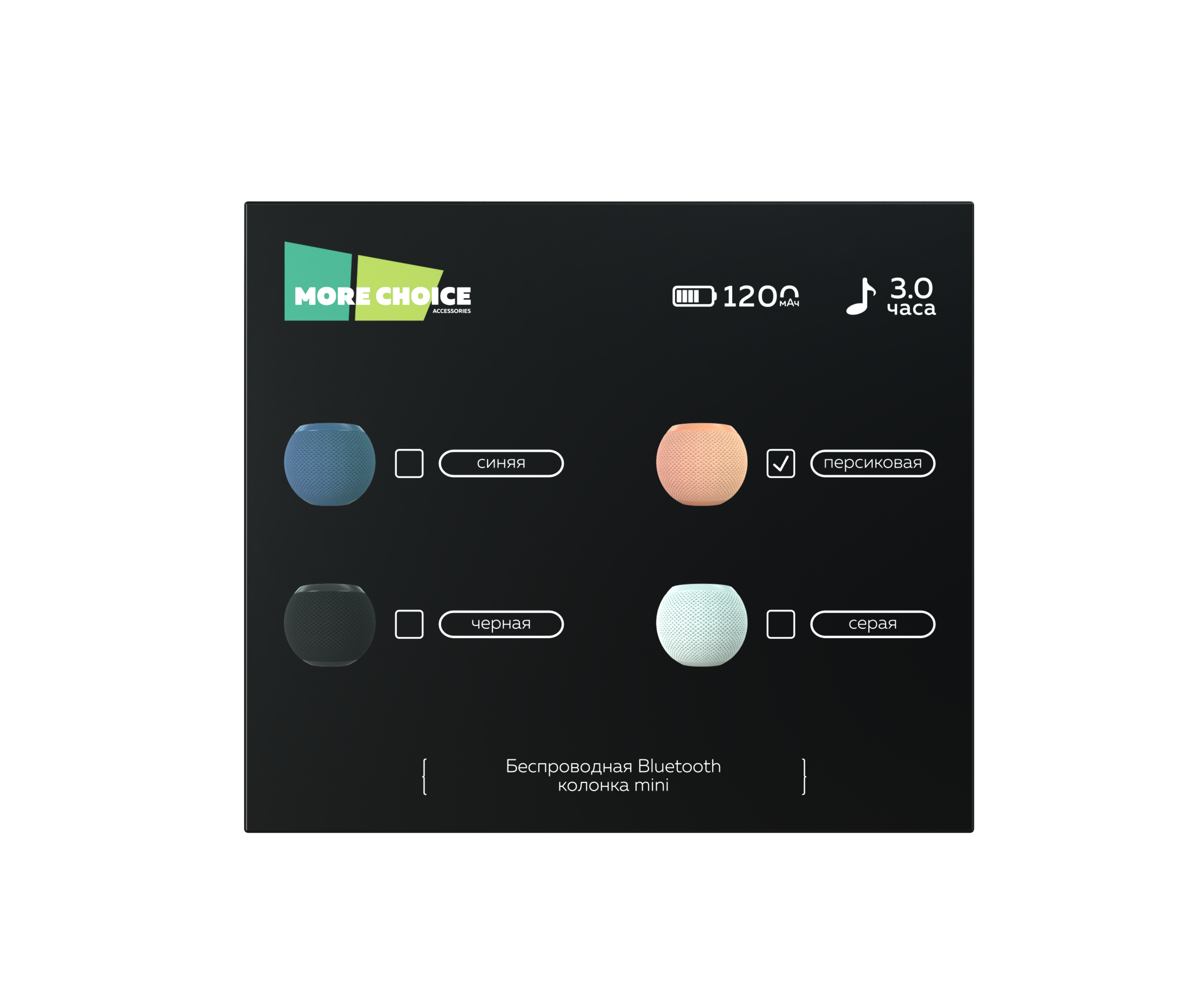 Тип беспроводного соединения: Bluetooth V5.3. Диапазон передачи: 10м. Поддерживаемые протоколы: L2CAP/A2DPAVCTP/HSP/HFP. Тип подключения: беспроводной. Поддерживает носители: Bluetooth, FM приемник. Разъемы: TF-карта/ USB/ Type-C/ AUX. Количество динамиков: 1. Размер динамика: 57mm. Номинальная мощность динамика: 5W. Диапазон воспроизводимых частот: 120Hz-20kHz. Чувствительность: 90dB. Импеданс: 3.6Оm. Емкость аккумулятора: 5V/1200 mАh. Время работы в режиме воспроизведения: 3ч. Время зарядки: 4ч. Порт для зарядки: Type-C. Тип управления устройством: кнопки на устройстве. Микрофон: да. LED индикатор состояния: да. Громкая связь: HSP/HFP функция громкой связи. Линейный AUX вход: да. Совместимость с Android, iOS, MAC, Windows. Крепление: силиконовый шнурок для удобной переноски устройства. Материал: ABC пластик, ткань. Цвет: черный, белый, синий, персиковый. Размер: 11.1*11.1*87 см. Вес: 332 г.