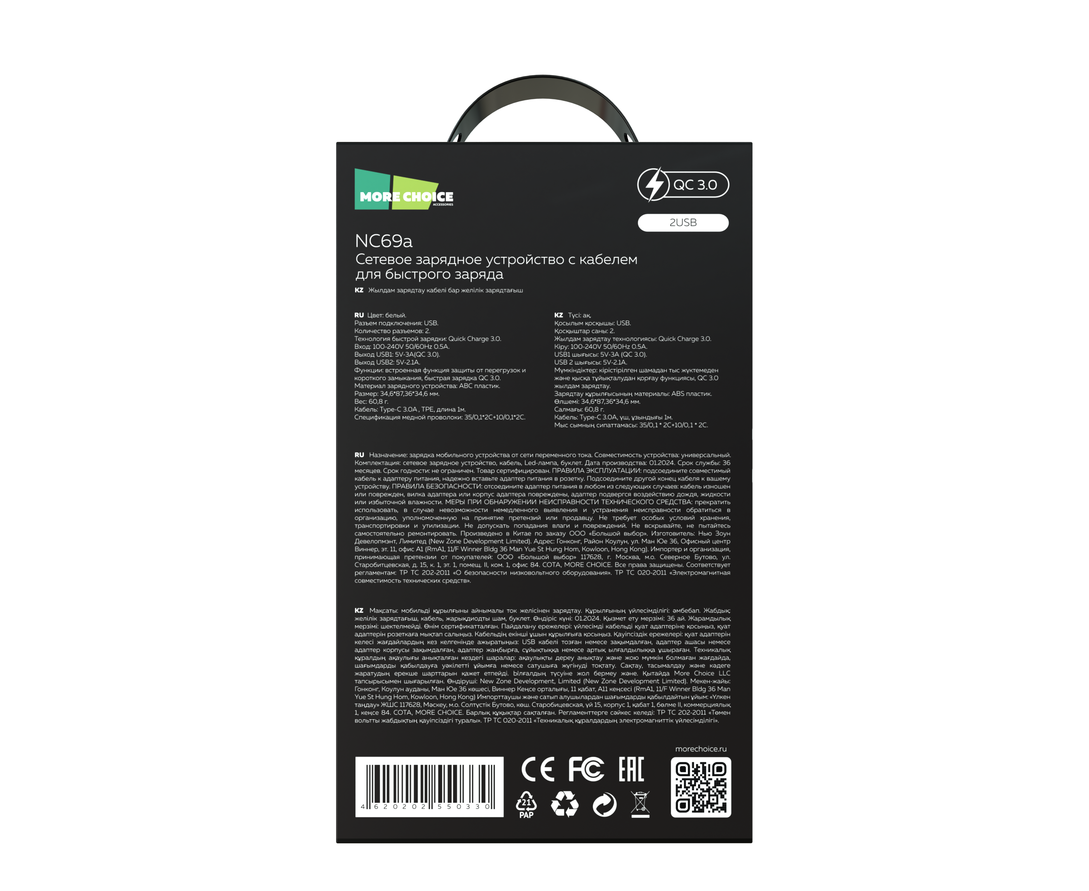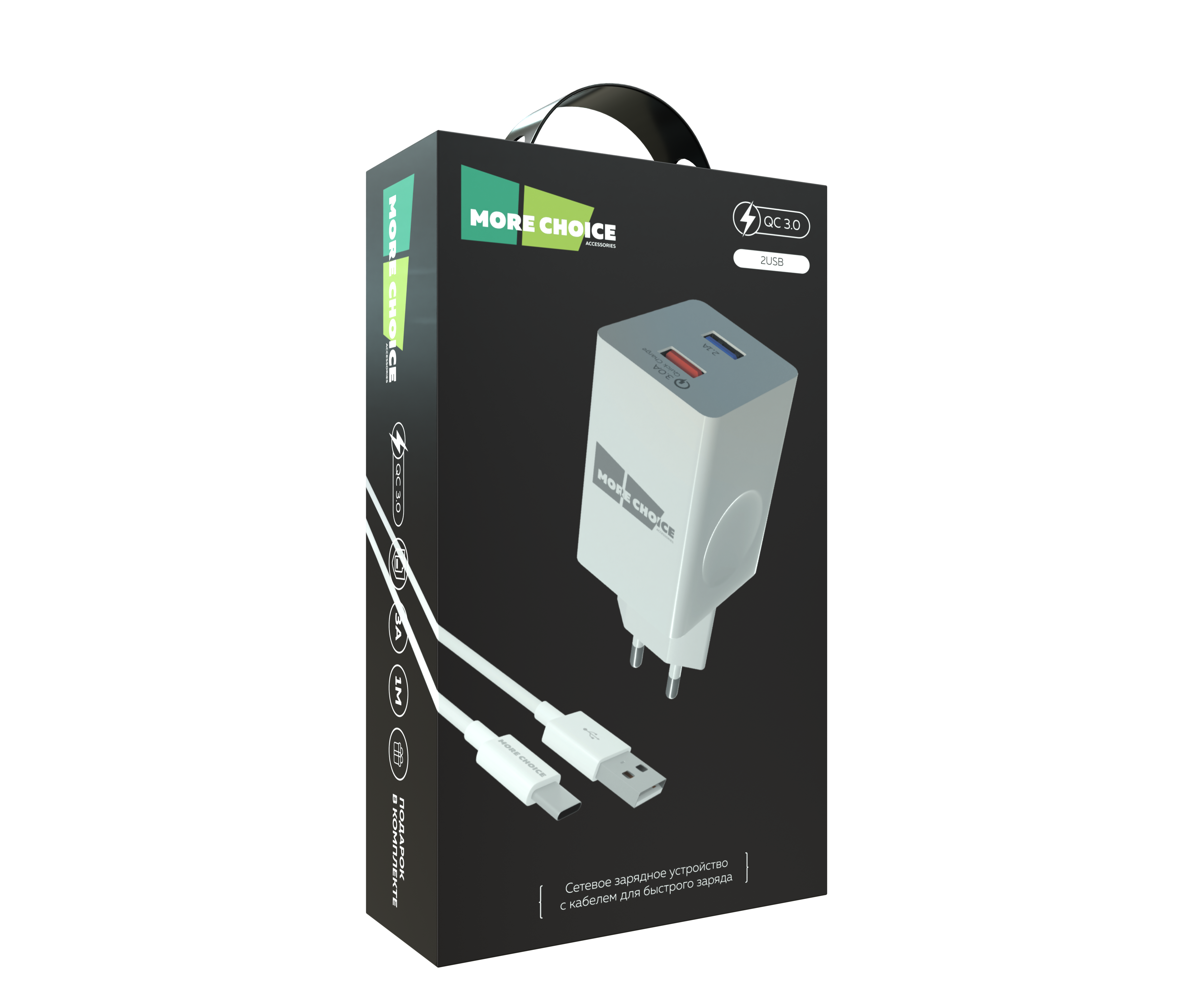 Материал: АВС-пластик Количество разъемов USB: 2 Вход: 100В/240В. Максимальный выходной ток: 3.0 A Дата-кабель в комплекте: Type-C (1 м) Технология ускоренного заряда: Quick Charge 3.0 Комплектация: сетевое зарядное устройство, дата-кабель, LED лампа, буклет Цвета: Black, White