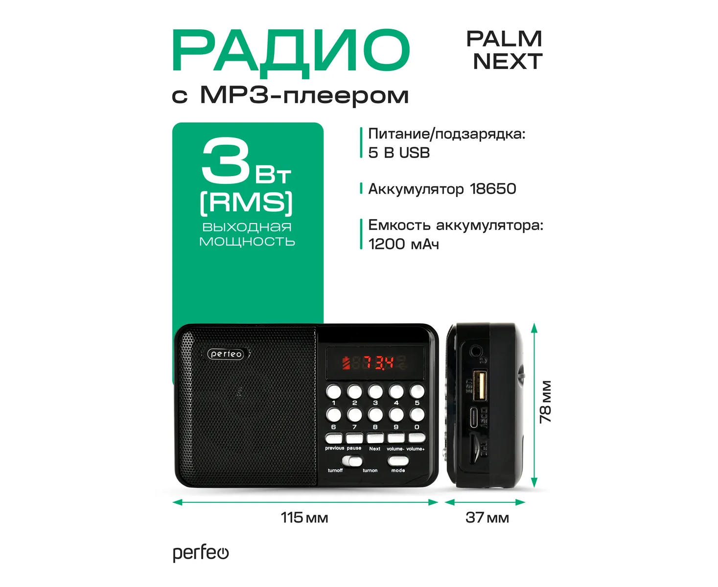 Радиоприемник цифровой Perfeo PALM (i90). Радио с расширенным функционалом умеет воспроизводит MP3-файлы с карт памяти и USB-флэшек. Приемник может работать не только от аккумуляторов (18650), но и от адаптера для зарядки (в комплект не входит) подключенного в сеть 220В. Радиоприемник от сети имеет встроенное цифровой тюнер FM (87,5 – 108 МГц) с автоматическим поиском станций. Радио оснащено поворотной телескопической антенной, возможность воспроизведения музыки с USB flash и microSD карт памяти, вход AUX для подключения источника звука. LED-дисплеем (отображает номера mp3-треков и частоту радиостанции). В комплекте идет кабель miniUSB для зарядки радиоприемника. Радиоприемник мини компактного размера удобно переносить, он помещается в карман. Это радио на аккумуляторе можно слушать даже ночью и не беспокоится, что можно кого-то разбудить, ведь у колонки с радио есть разъем для наушников. Радио PALM – отличный попутчик для поездок, путешествий и прогулок. Радиоприемник от сети и аккумулятора - легкий, удобный, компактный и многофункциональный, не займет много места и не оставит вас без любимой музыки. В нашем ассортименте магазина Perfeo есть множество портативных радиоприемников, они станут отличным подарком для родителей, дедушек и бабушек, подарят хорошее настроение и станут украшением вашего интерьера, прекрасно впишутся в любой дизайн, как дома, так и на даче, незаменимы в походе. Радиоприемник легко зарядить от повербанка, он не прихотлив в использовании.