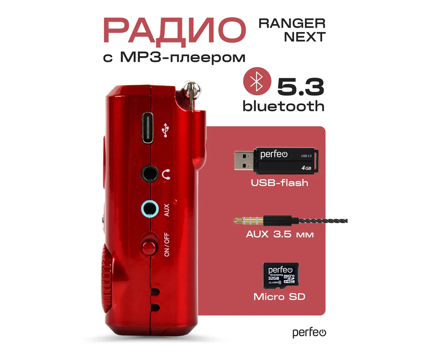 Радиоприемник Bluetooth цифровой Perfeo Sound Ranger Next/ УКВ+FM/ MP3/ Bluetooth 5.3/ 1000 mAh/ Красный, (Арт. PF_D0563)