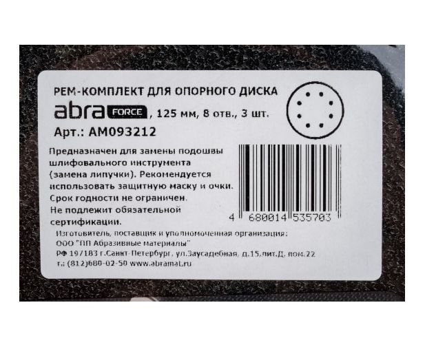 Рем-комплект для опорного диска шлифовальной машинки ABRAforce, диаметр 125мм, 8 отверстий ( в упаковке 3 шт.) Назначение: замена подошвы шлифовального инструмента. Альтернативный вариант покупки новой дорогостоящей подошвы. Данная продукция является востребованной на рынке.