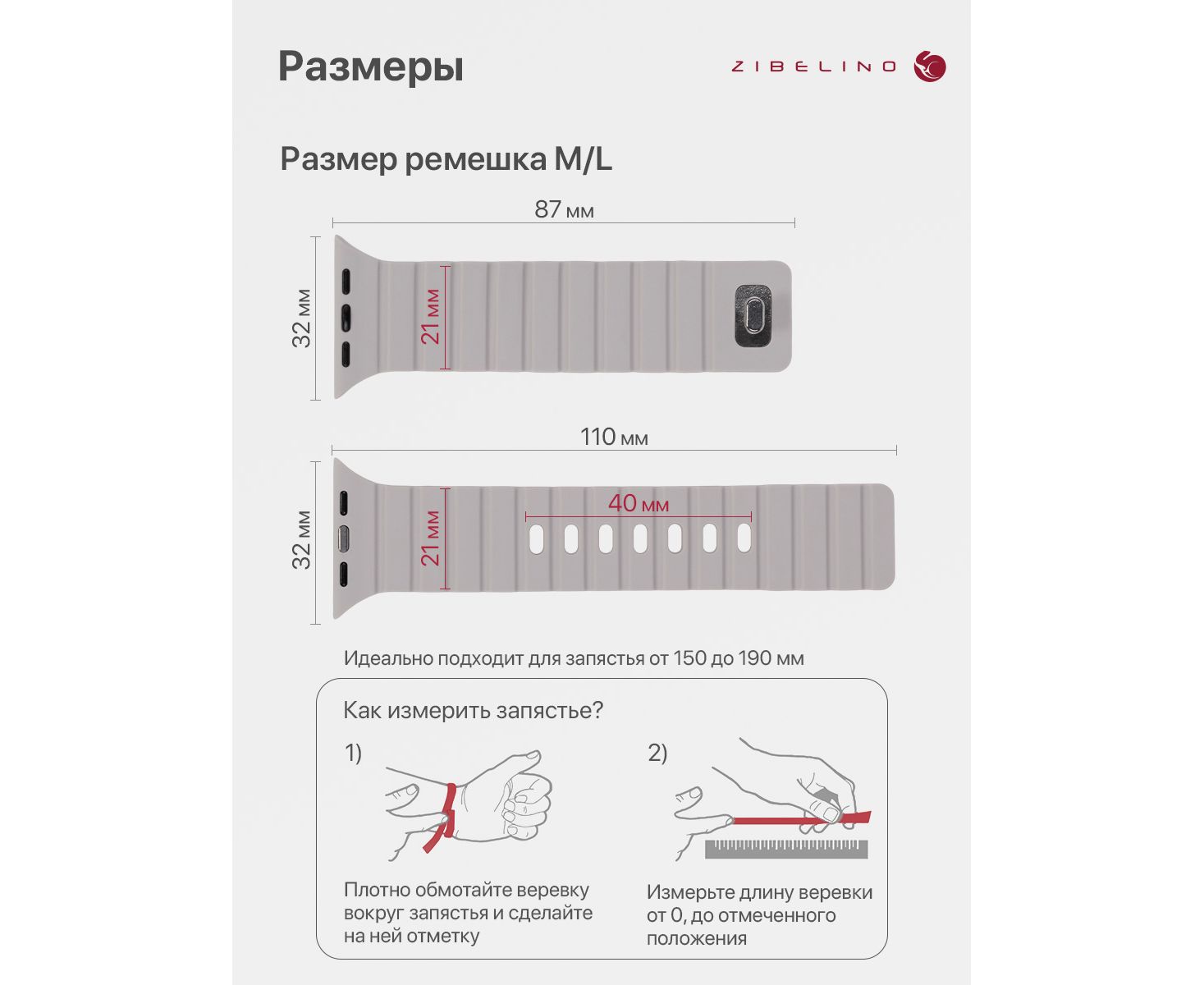 Ремешок размера M/L подходит для запястья обхватом от 15 до 19 см. Размер ремешка 195x21x2мм.