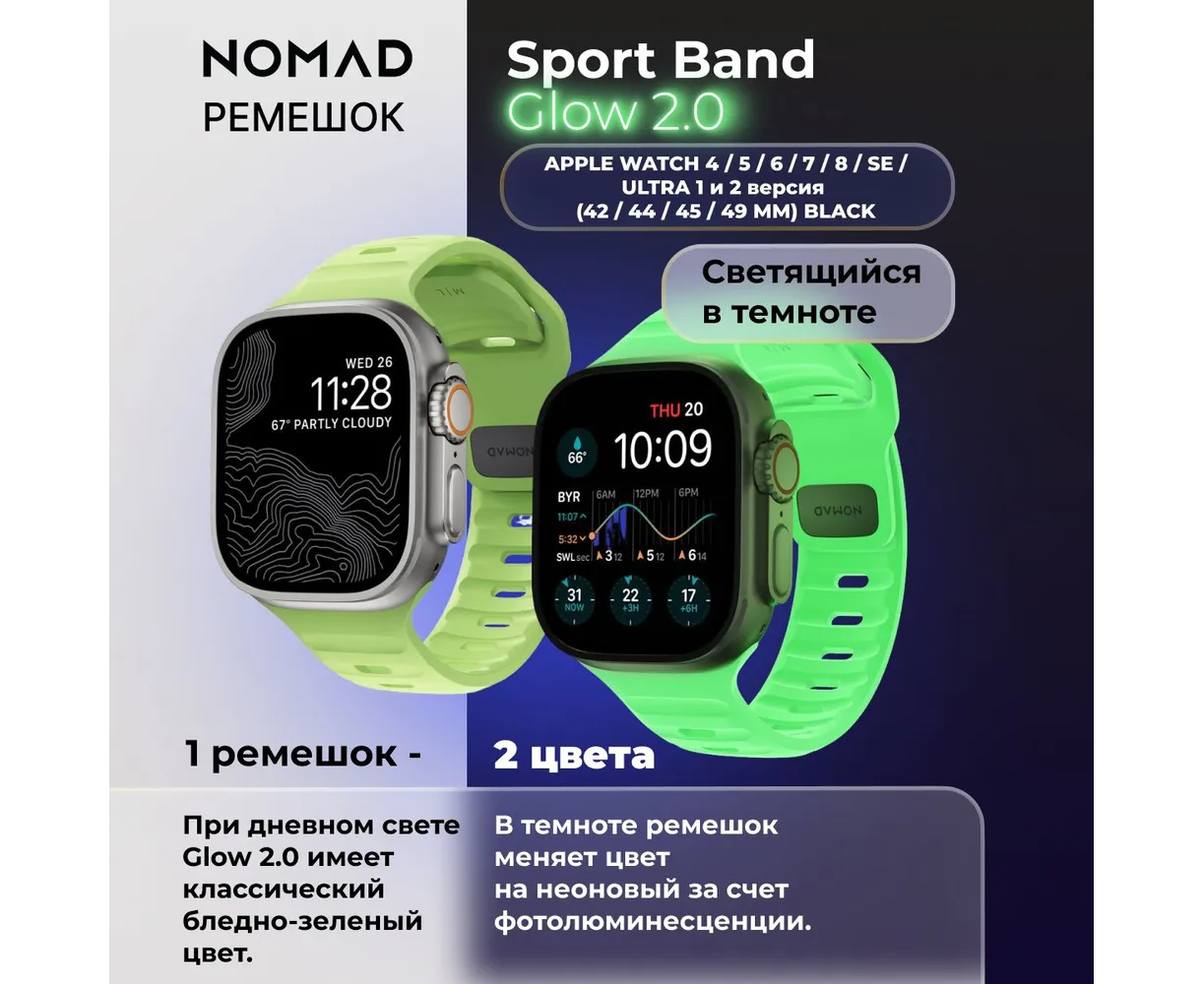 Ремешок Nomad Sport Strap, Glow 2.0 - Apple Watch Ultra 2/1 (49mm) 9/8/7 (45mm)/6/SE/5/4 (44mm)/3/2/1 (42mm)