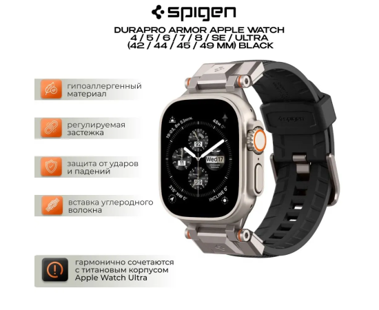 Ремешок SPIGEN DURAPRO ARMOR APPLE WATCH 4 / 5 / 6 / 7 / 8 / SE / ULTRA (42 / 44 / 45 / 49 MM) BLACK (двухслойный ремешок за счёт использования двух материалов нейлона и ТПУ; металлические соединители)