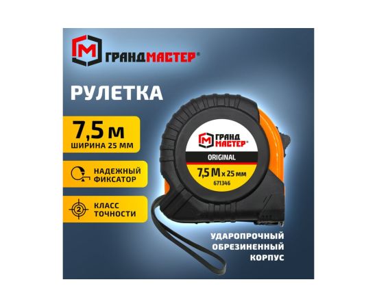 Рулетка измерительная ГРАНДМАСТЕР 671346 Original 7,5м*25мм, обрезиненный корпус, с фиксатором