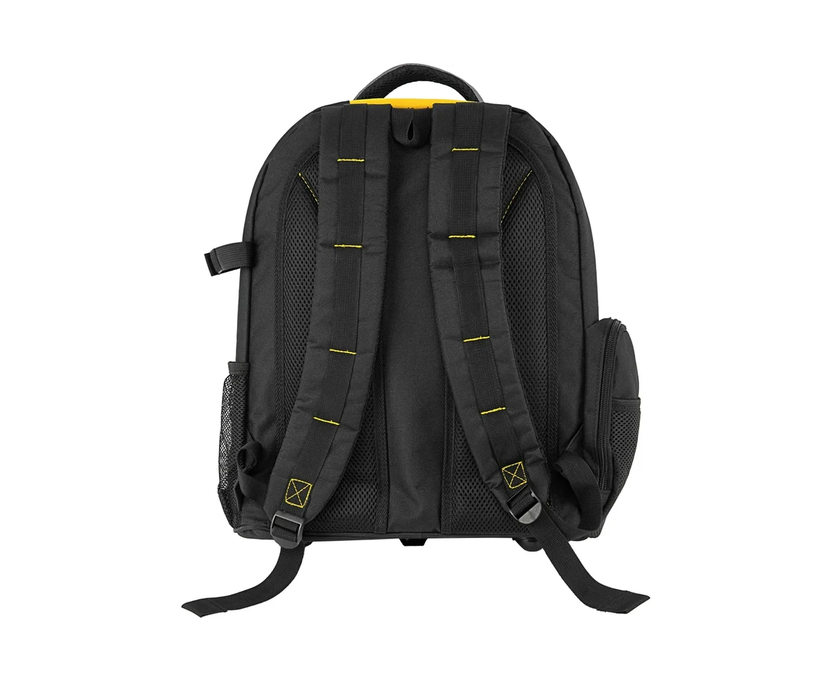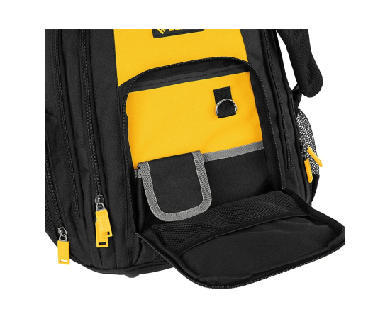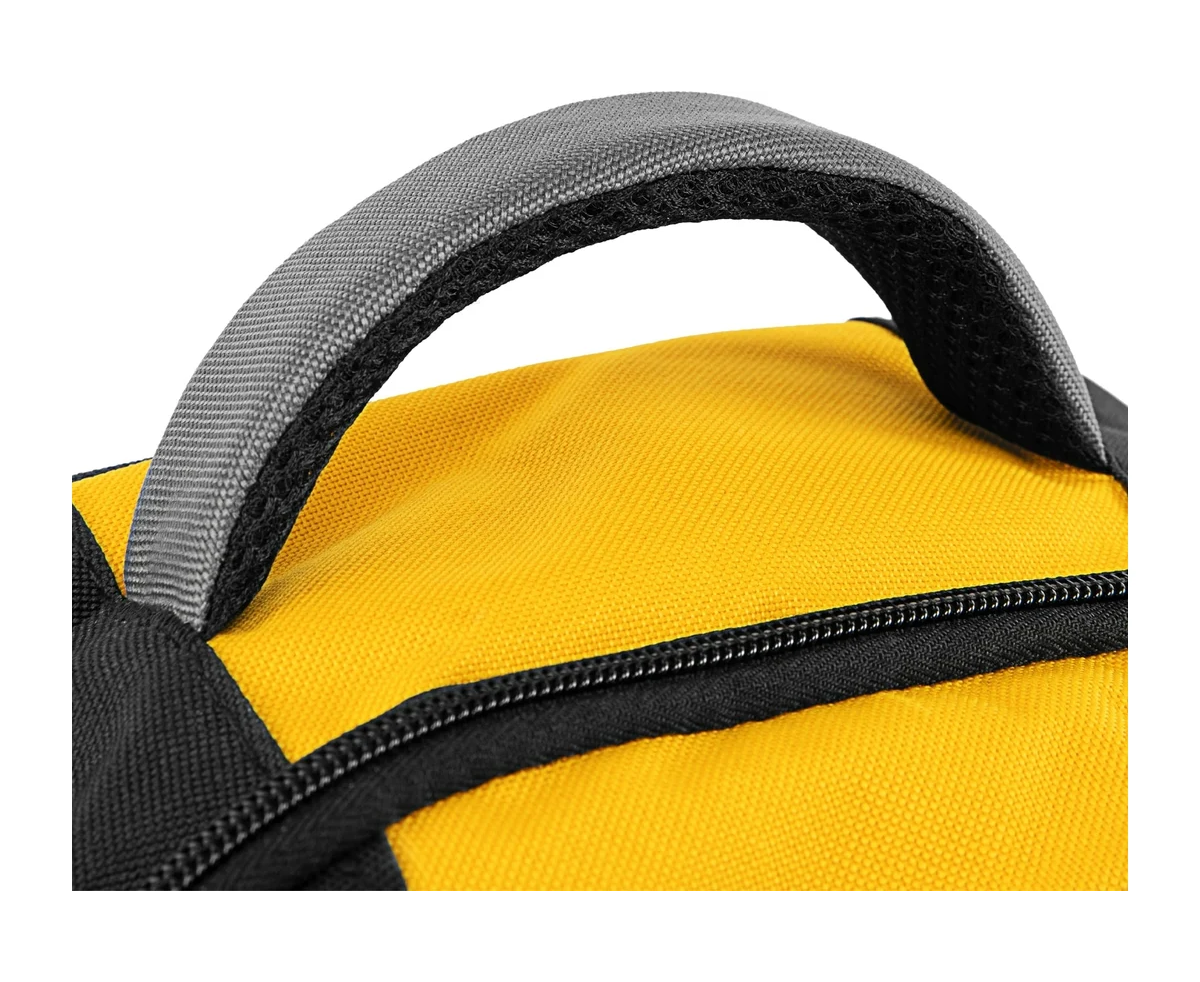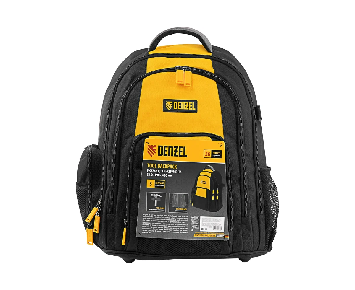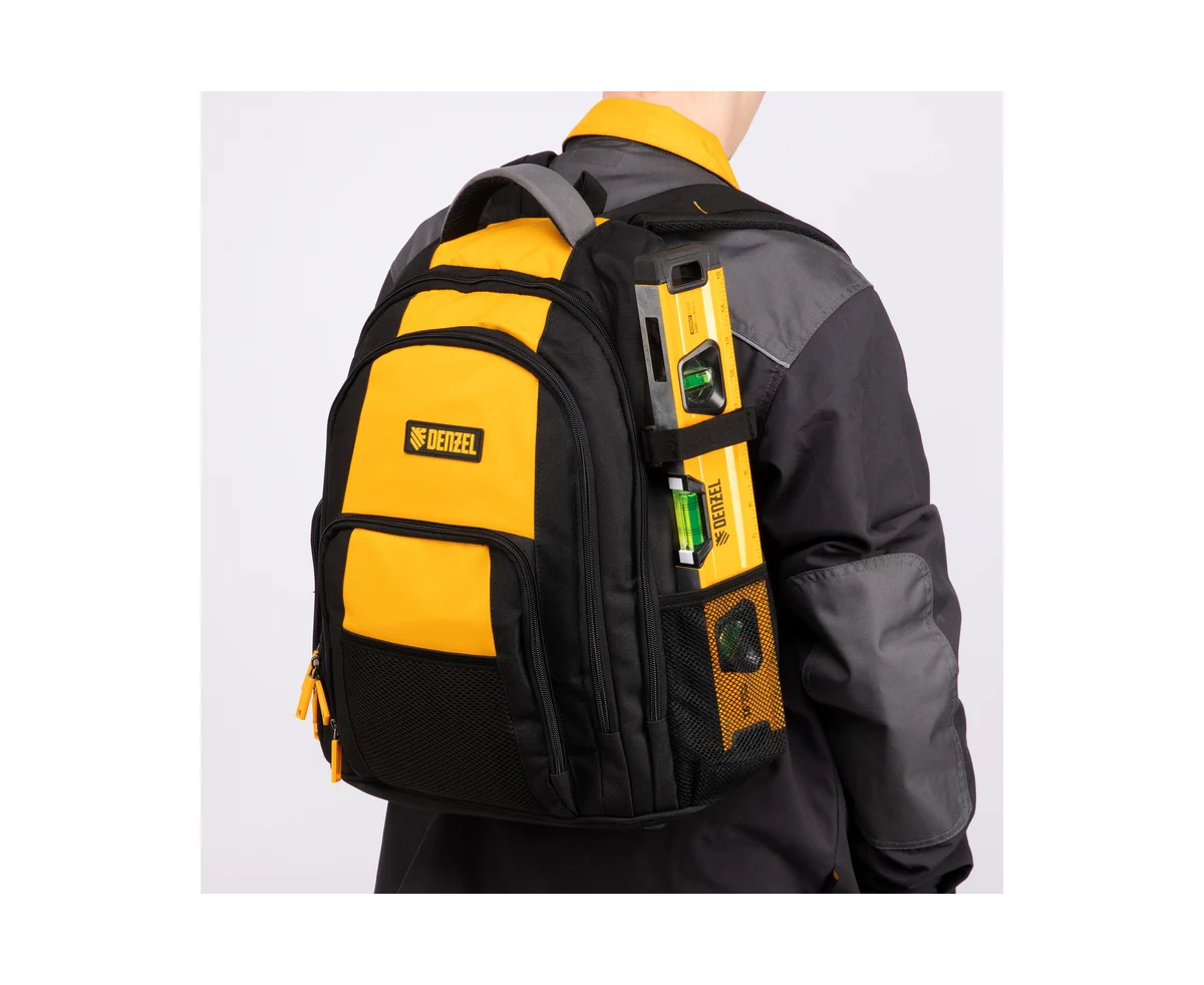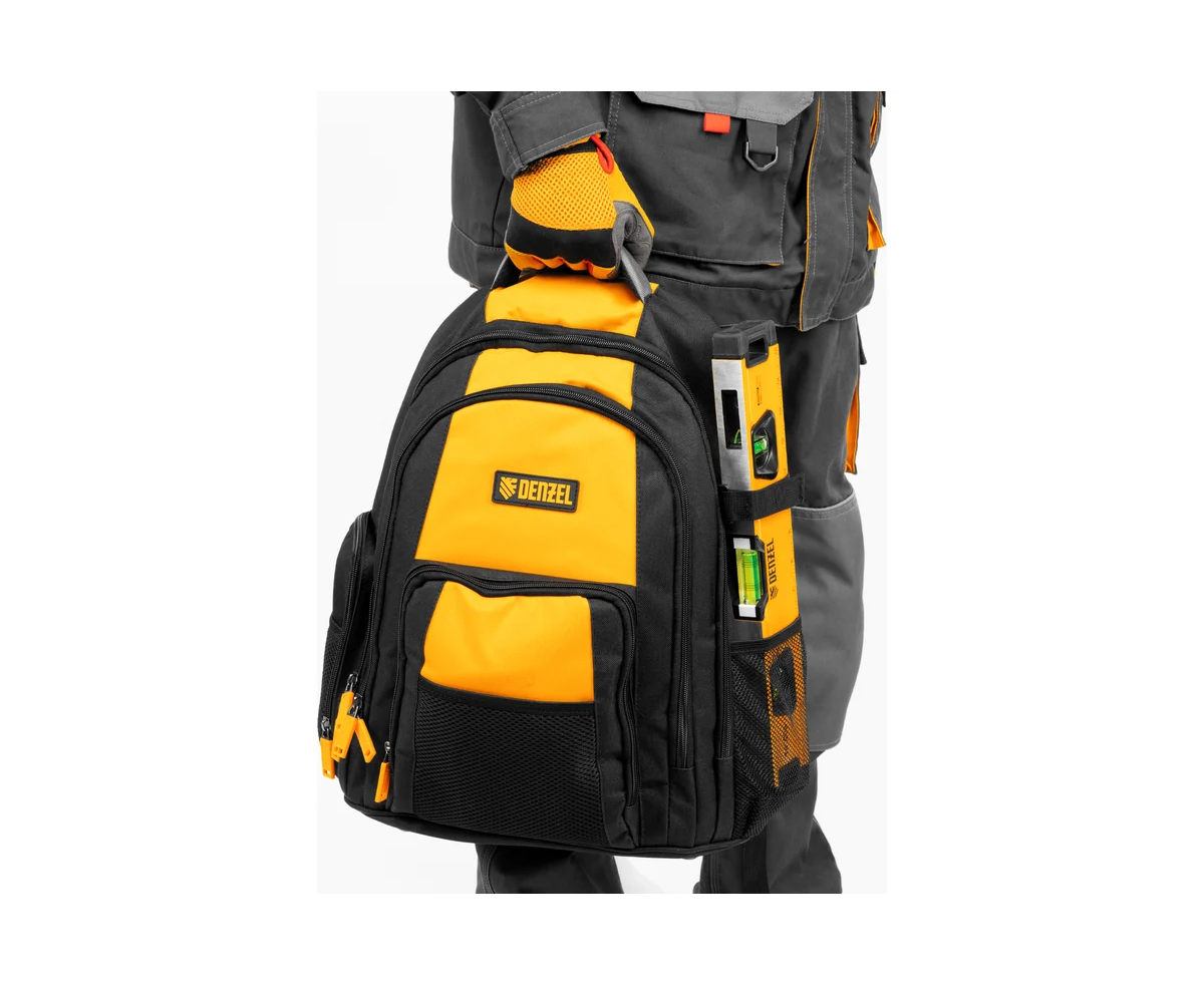 Рюкзак Denzel 90296 размером 365 х 190 х 430 мм, с 3 отделениями и 26 карманами (в том числе сетчатыми), предназначен для размещения и транспортировки ручного инструмента. 3 секции позволяют организовать упорядоченное хранение всех необходимых предметов. Рюкзак пригодится выездному мастеру.